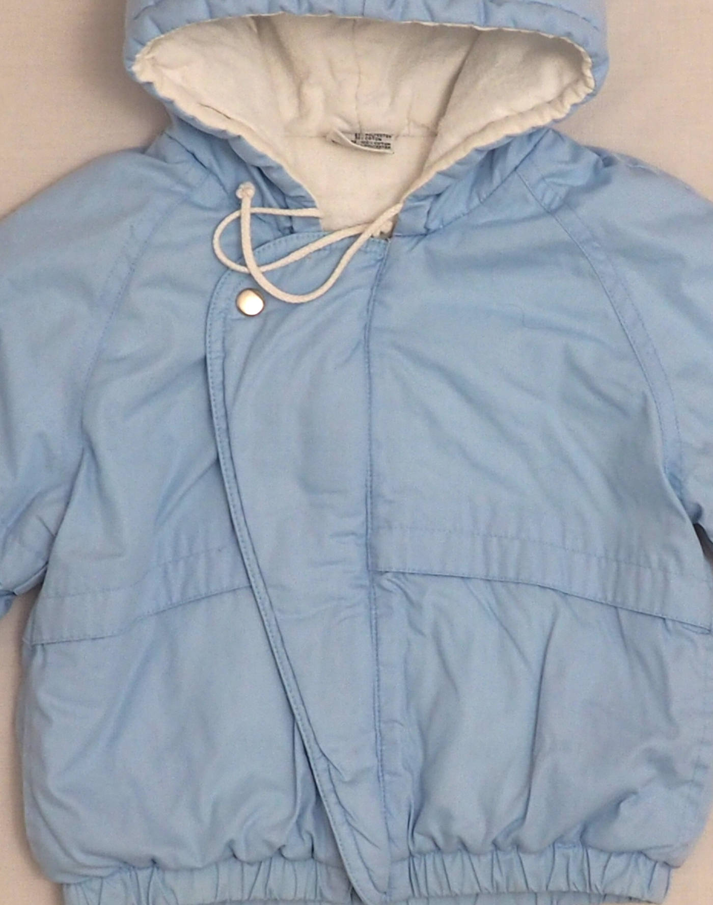 Small light-blue hooded jacket, lined and fleeced, elasticated cuffs, drawstring hood, zipper with buttoned flap. Very good condition, outer fabric 65% polyester, 35% cotton, lining 100% cotton, polyester fleece.