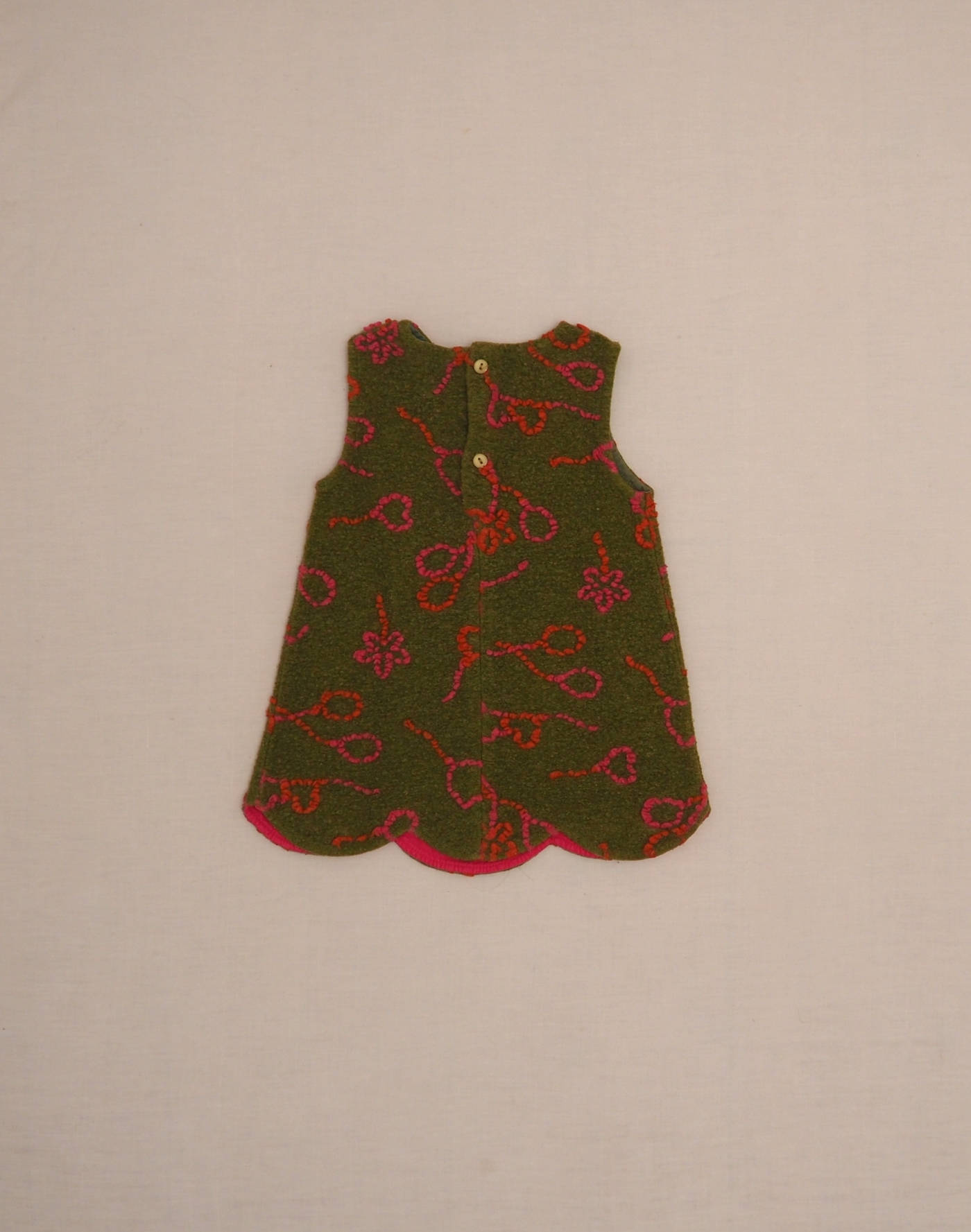 Cute winter dress to wear over a shirt or undershirt, khaki boiled wool effect with textured balloon motif, rounded seam on bottom of dress, closed at back with two buttons. Very good condition, fabric 49% acrylic, 33% wool, 18% polyester.