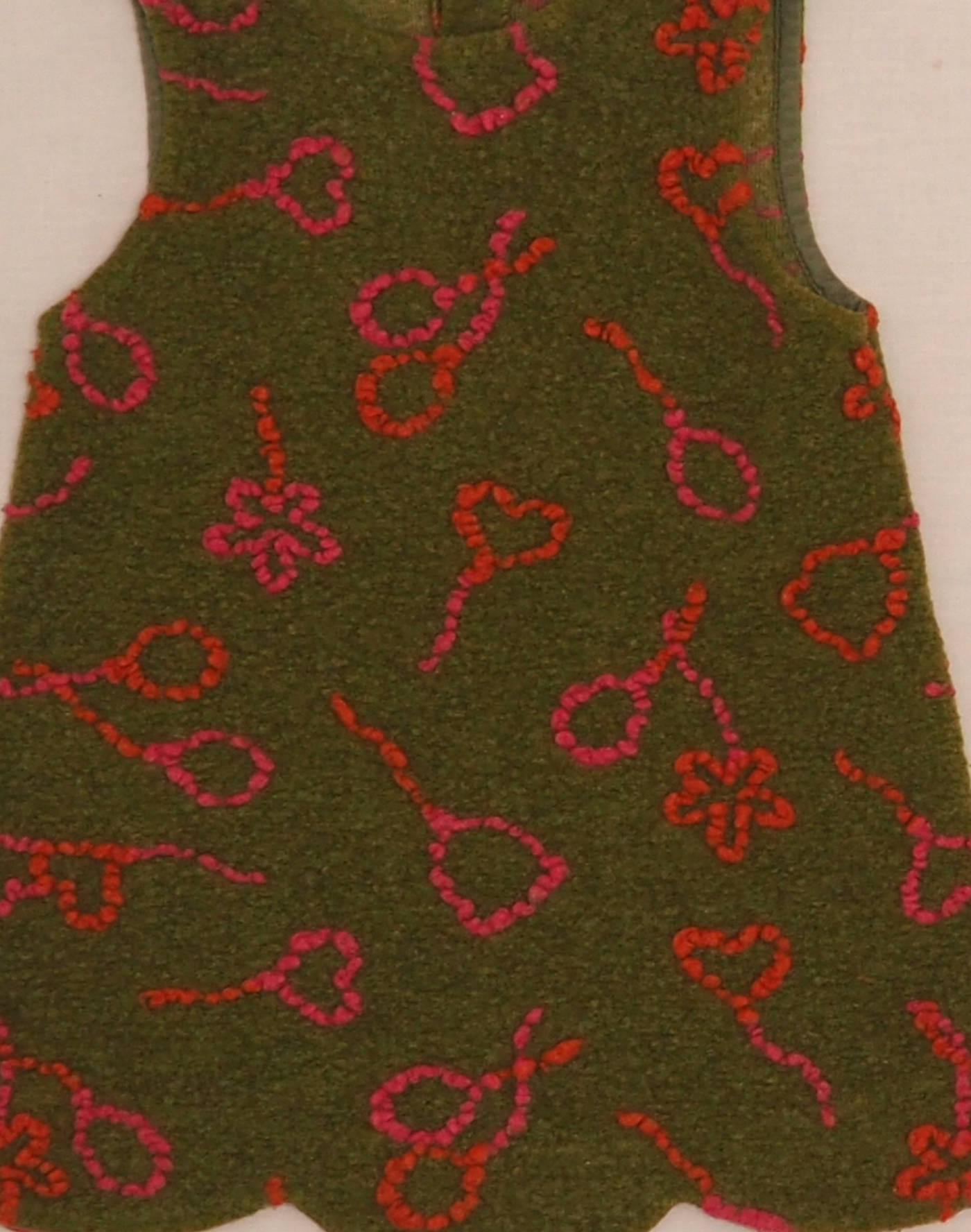 Cute winter dress to wear over a shirt or undershirt, khaki boiled wool effect with textured balloon motif, rounded seam on bottom of dress, closed at back with two buttons. Very good condition, fabric 49% acrylic, 33% wool, 18% polyester.