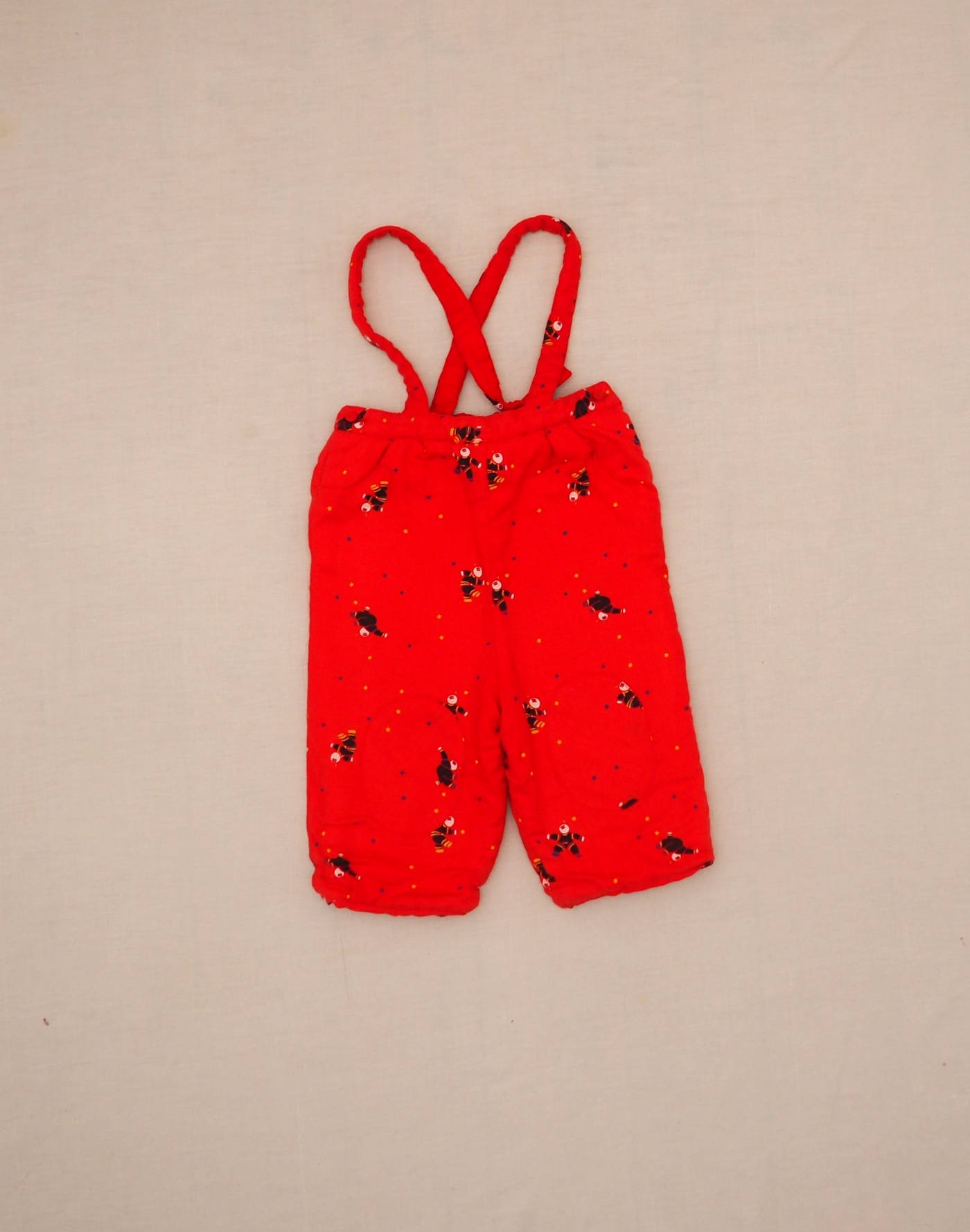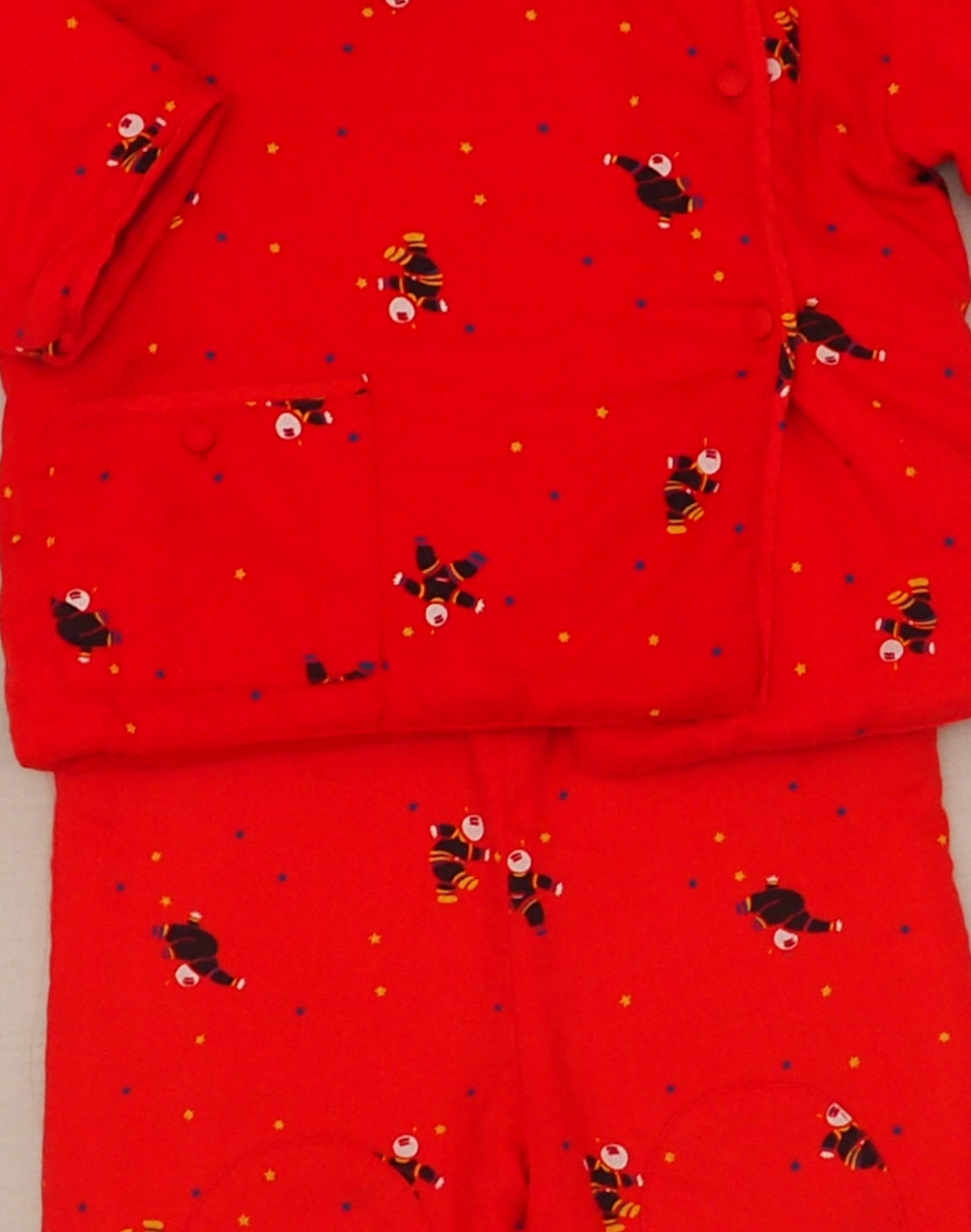 Vintage Cacharel. Magnificent winter ensemble in red cotton with astronaut and star print. Featuring a fleece jacket with mao collar, one front buttoned pocket, side closure with four fabric-covered buttons, small drawstring hood hidden in the collar. Pants with suspenders, also fleece-covered, knee-length appliqués, suspenders fastened behind with two buttons. Made in France, very good condition, 100% cotton.