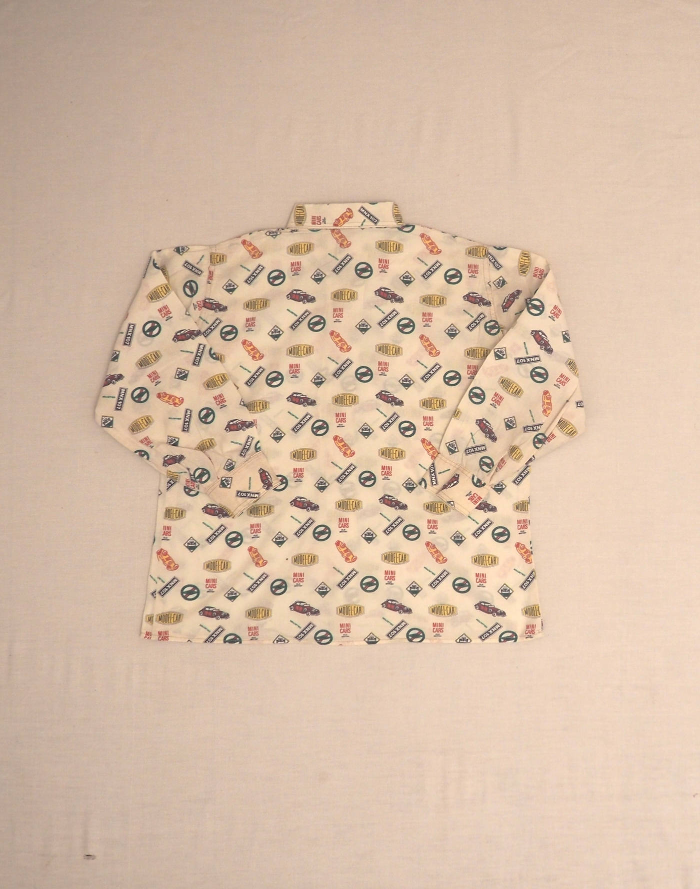 Beautiful white shirt with car & panel print, long buttoned sleeves, closed with five buttons. Very good condition, no composition label but cotton feel.