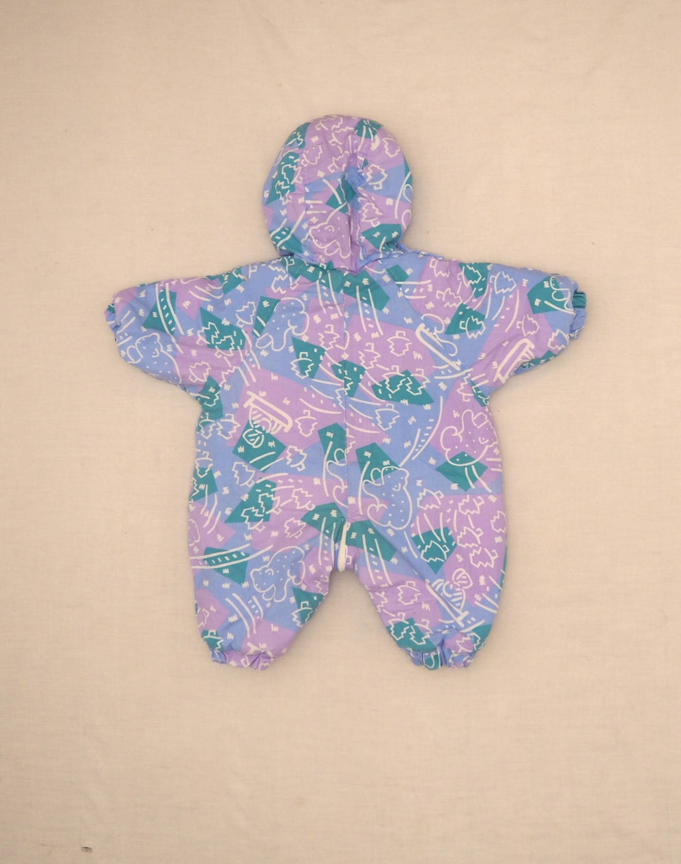 Cute fleece winter jumpsuit with typical eighties pattern, hood, elasticated cuffs and ankles, zipper with flap closed by five snap fasteners. Very good condition, 100% cotton fabric, polyester fleece.