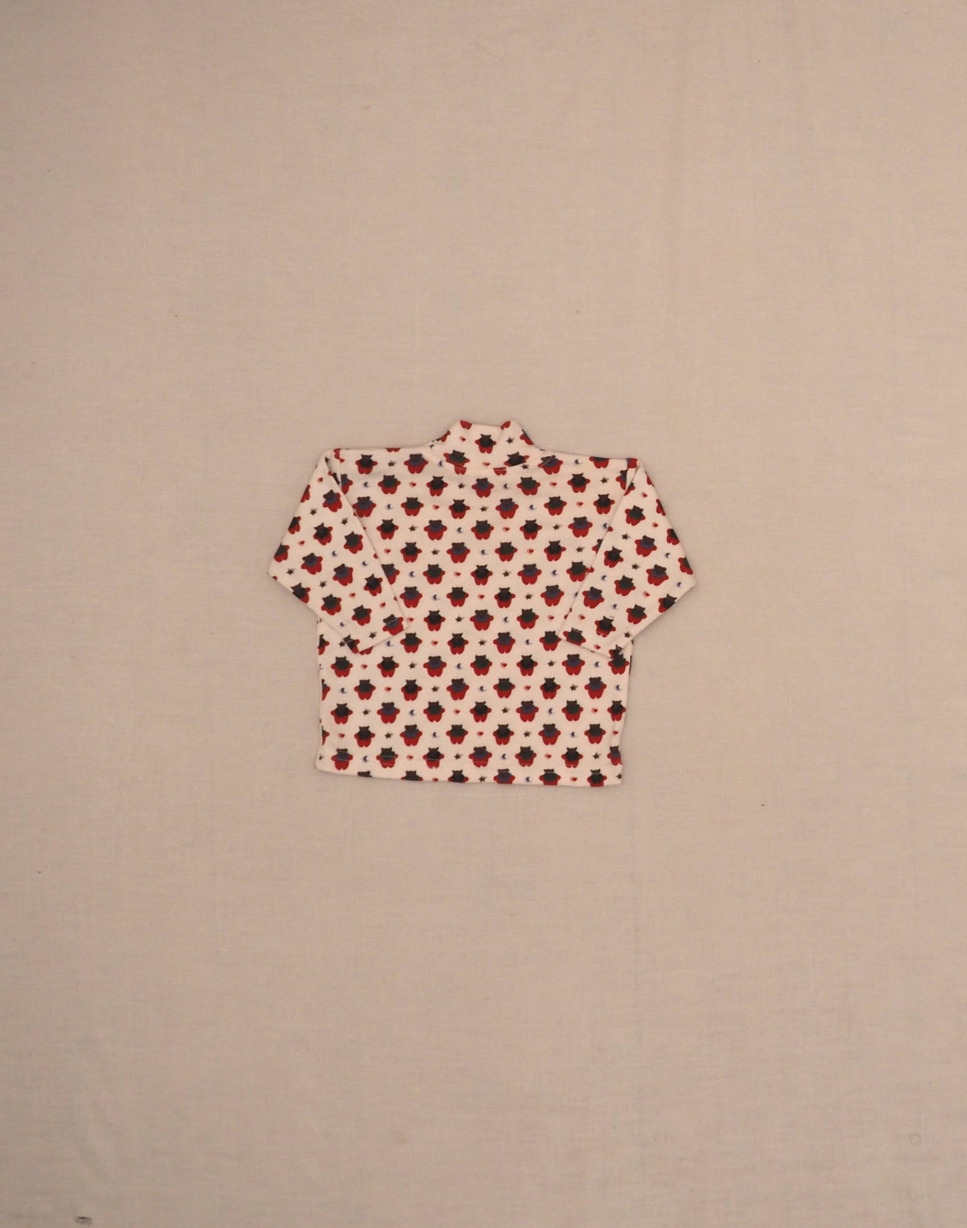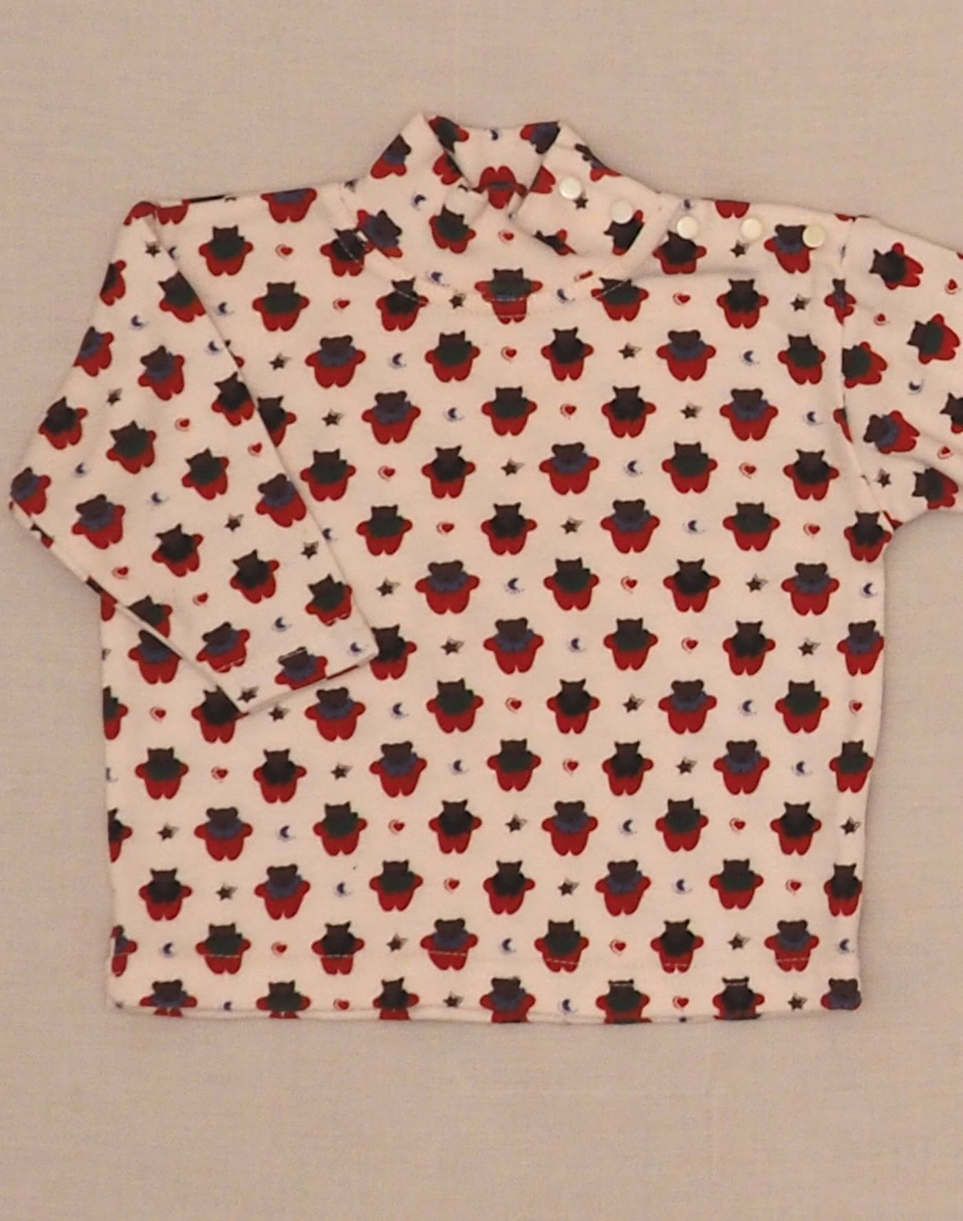 Adorable white jersey undershirt printed with little teddy bears, long sleeves, crew neck, fastened with five press studs. Very good condition, 100% cotton.