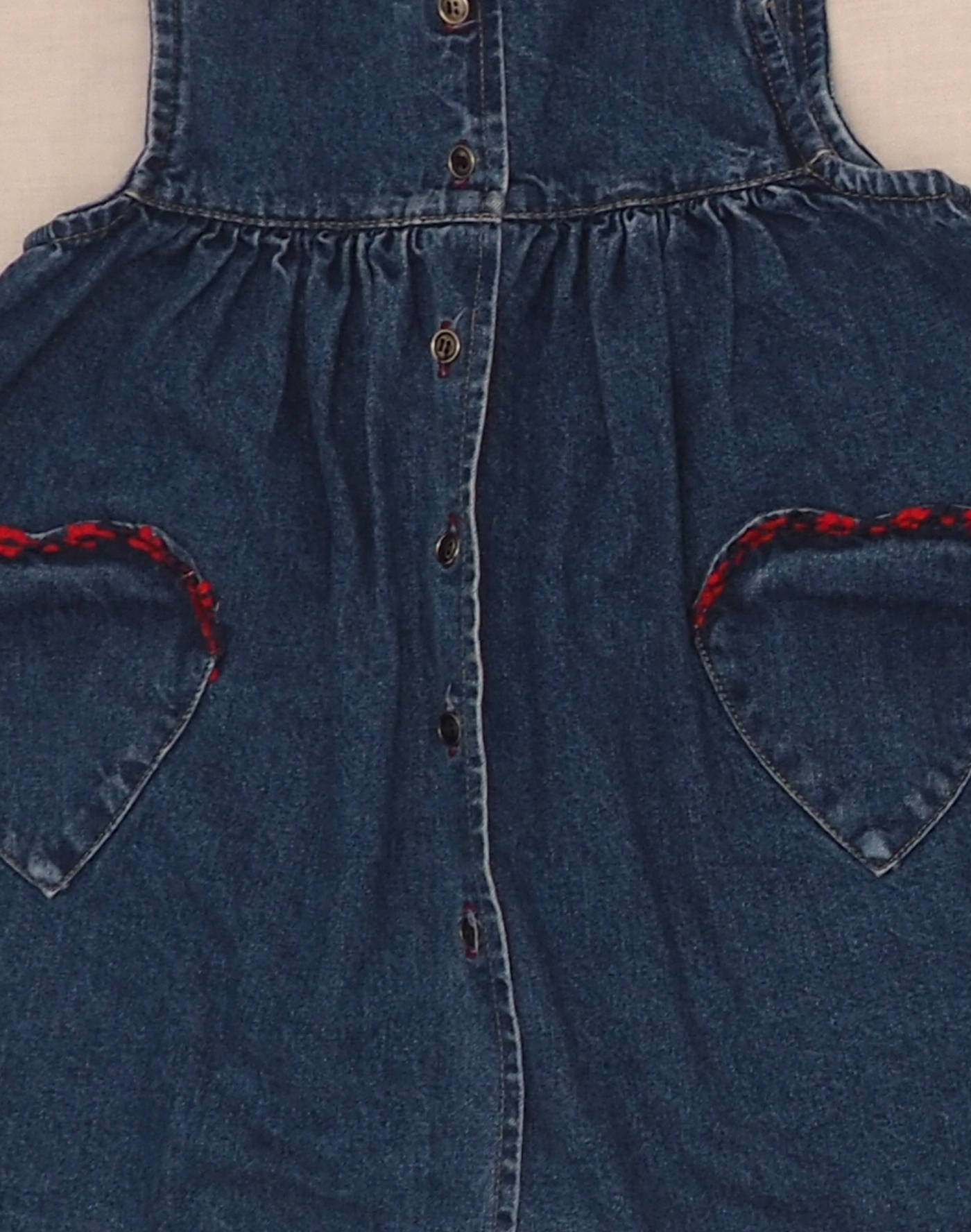 Beautiful dress in thick denim (all-season, wear in winter with an undershirt or shirt), sleeveless, pleated at the bust, two heart-shaped patch pockets in front, trimmed with floral ribbon. Fringe of three ribbons on bottom of dress. Closed with six buttons. Very good condition, 100% cotton.