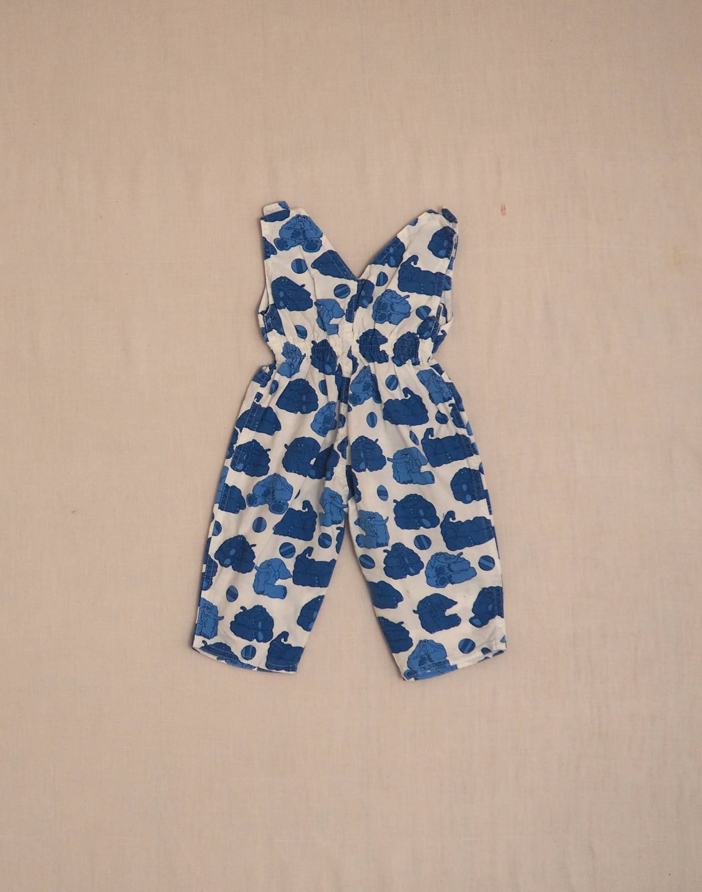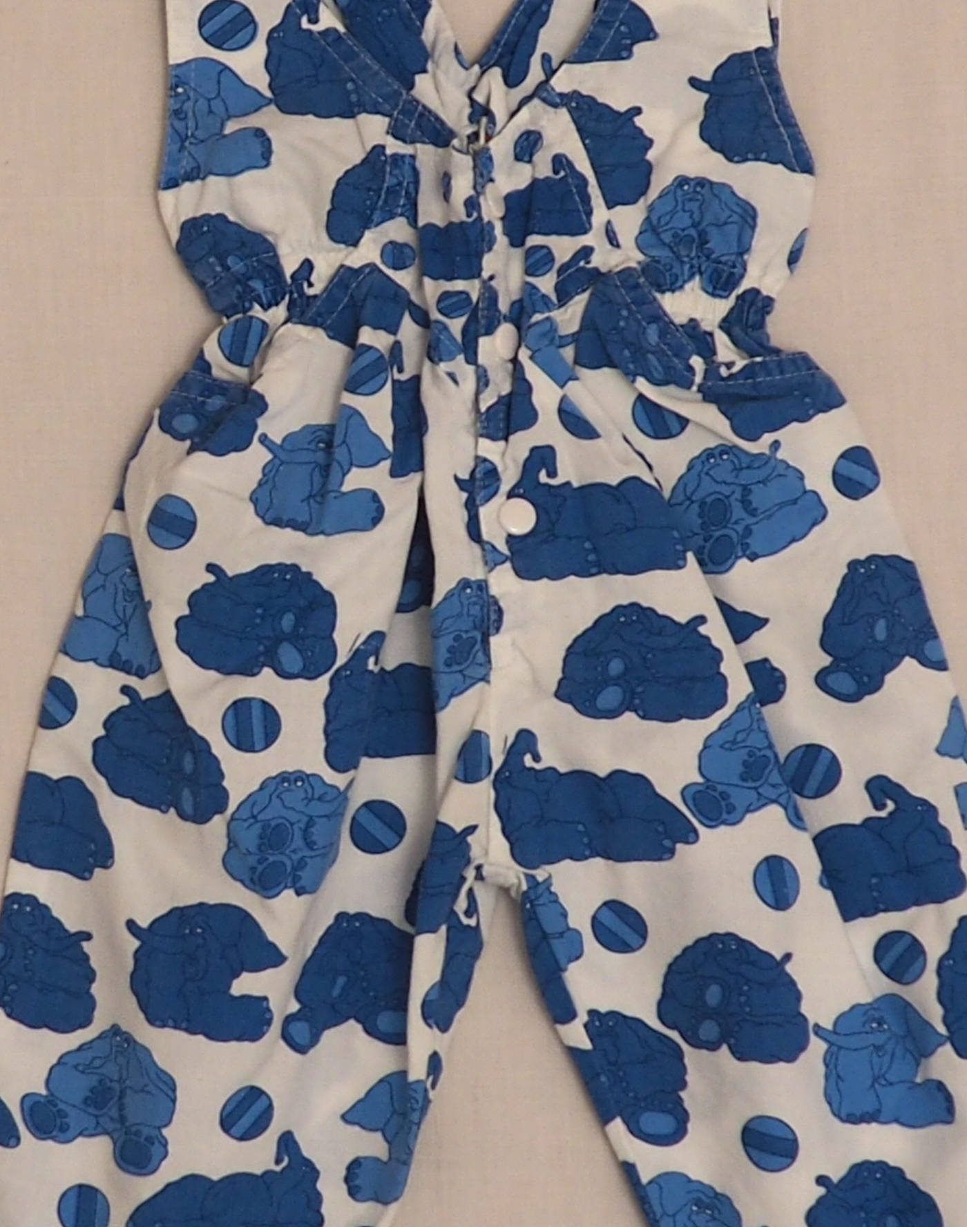 1980s dungarees with incredible elephant motif, elastic waistband, two front pockets, closed with three press studs. Made in Portugal, very good condition, no composition label but cotton feel.