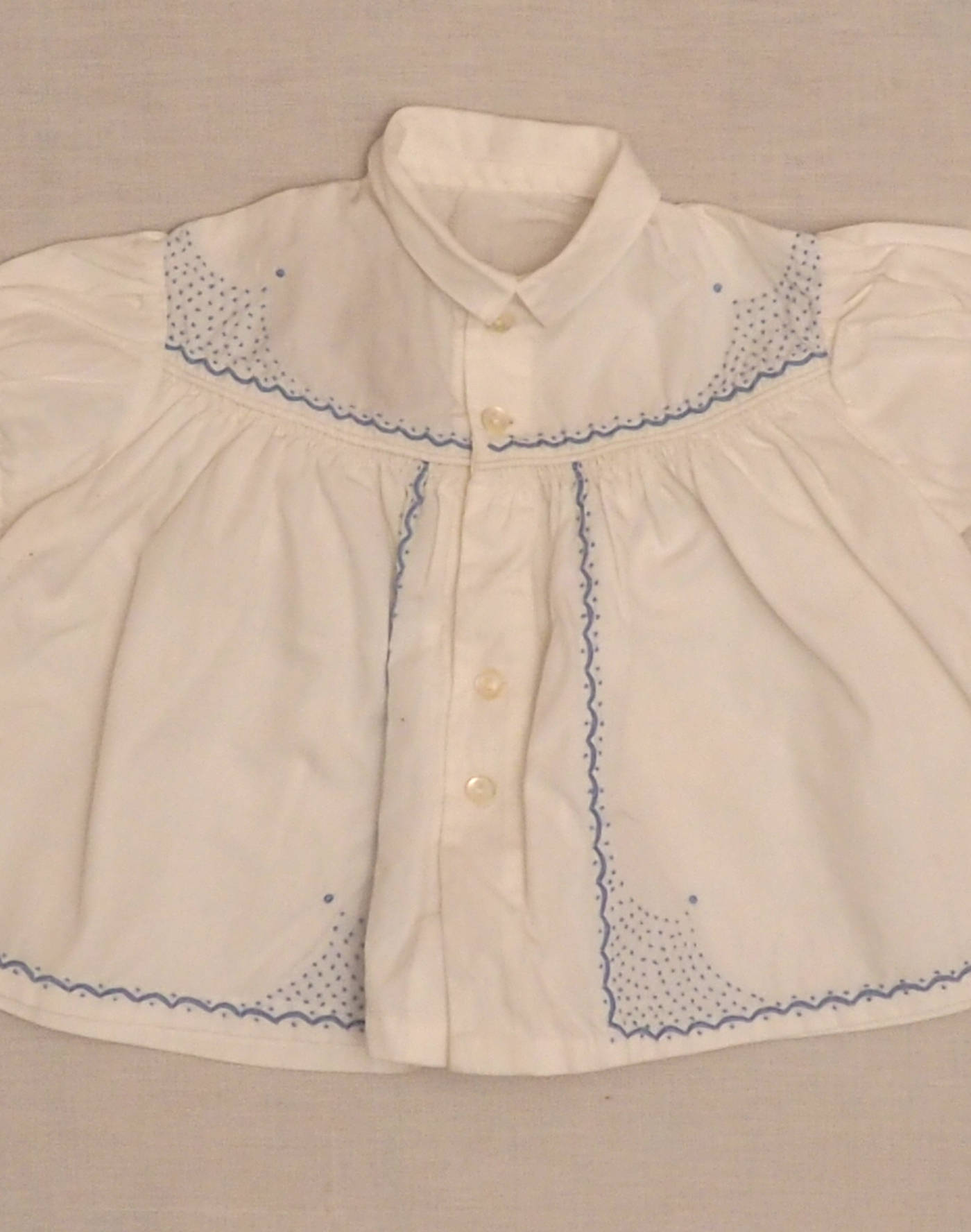 1950s. Delightful hand-sewn and embroidered blouse, short balloon sleeves, pleated on the bust and adorned with blue embroidery. Closed with four mother-of-pearl buttons. Very good condition, cotton feel.