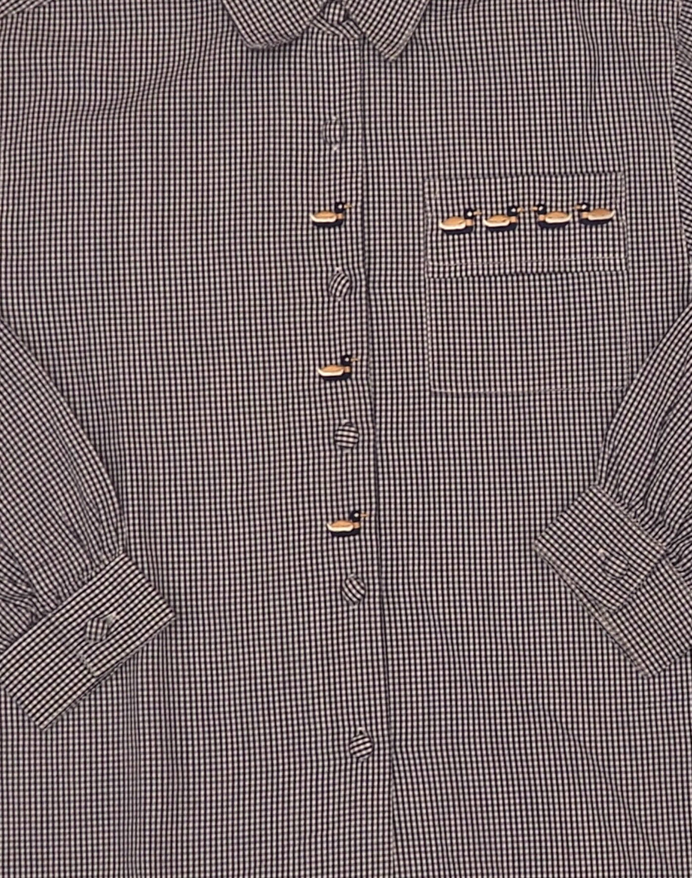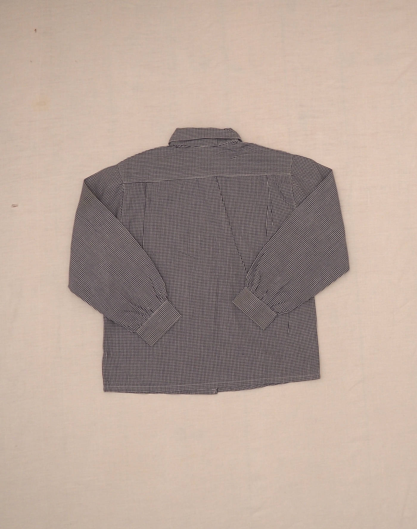 Size 8 years. Beautiful light navy blue gingham shirt, long buttoned sleeves, embroidered with ducks on the buttonhole and breast pocket. Closed with six fabric-covered buttons. Very good condition, 100% cotton.
