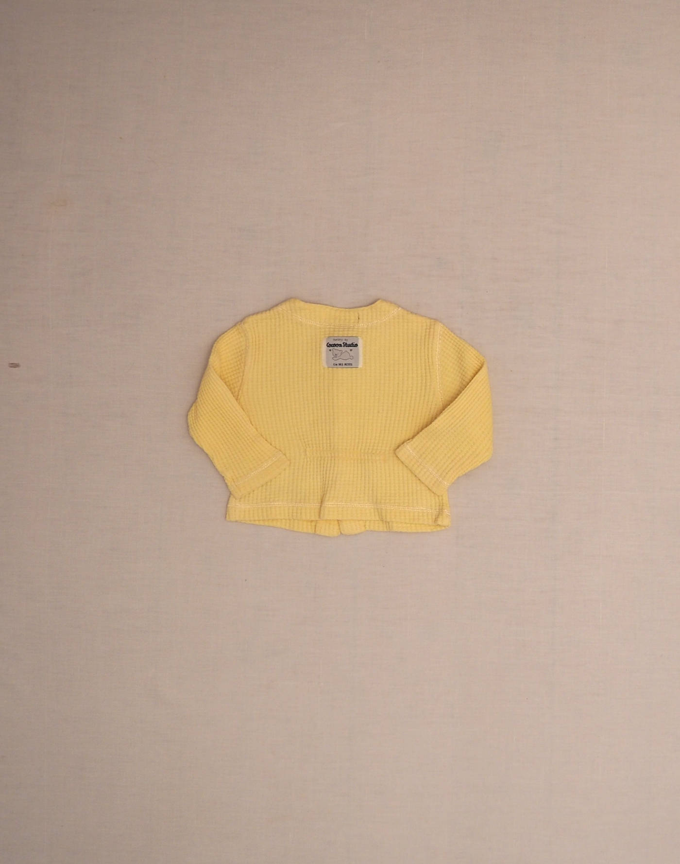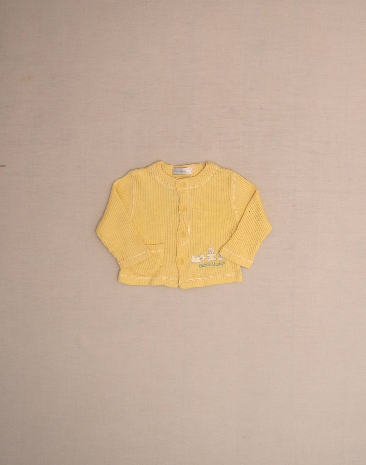 Cute lightweight cardigan in pale yellow honeycomb cotton, little teddy bears embroidered on the waist, one patch pocket in front, closed with four buttons. Very good condition, 100% cotton.