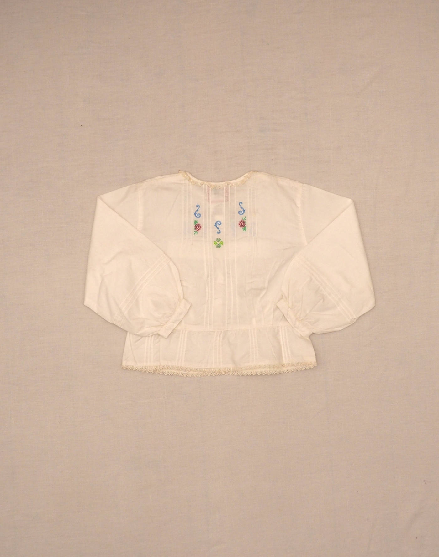 Size 6 years. Brand Alain Manoukian & Nicole Tran-Ba Vang. Magnificent ecru shirt with long balloon sleeves, sewn-in pleats & smocks, small lace edging the collar and waist, pretty embroidery on the bust. Very good condition, 100% cotton.