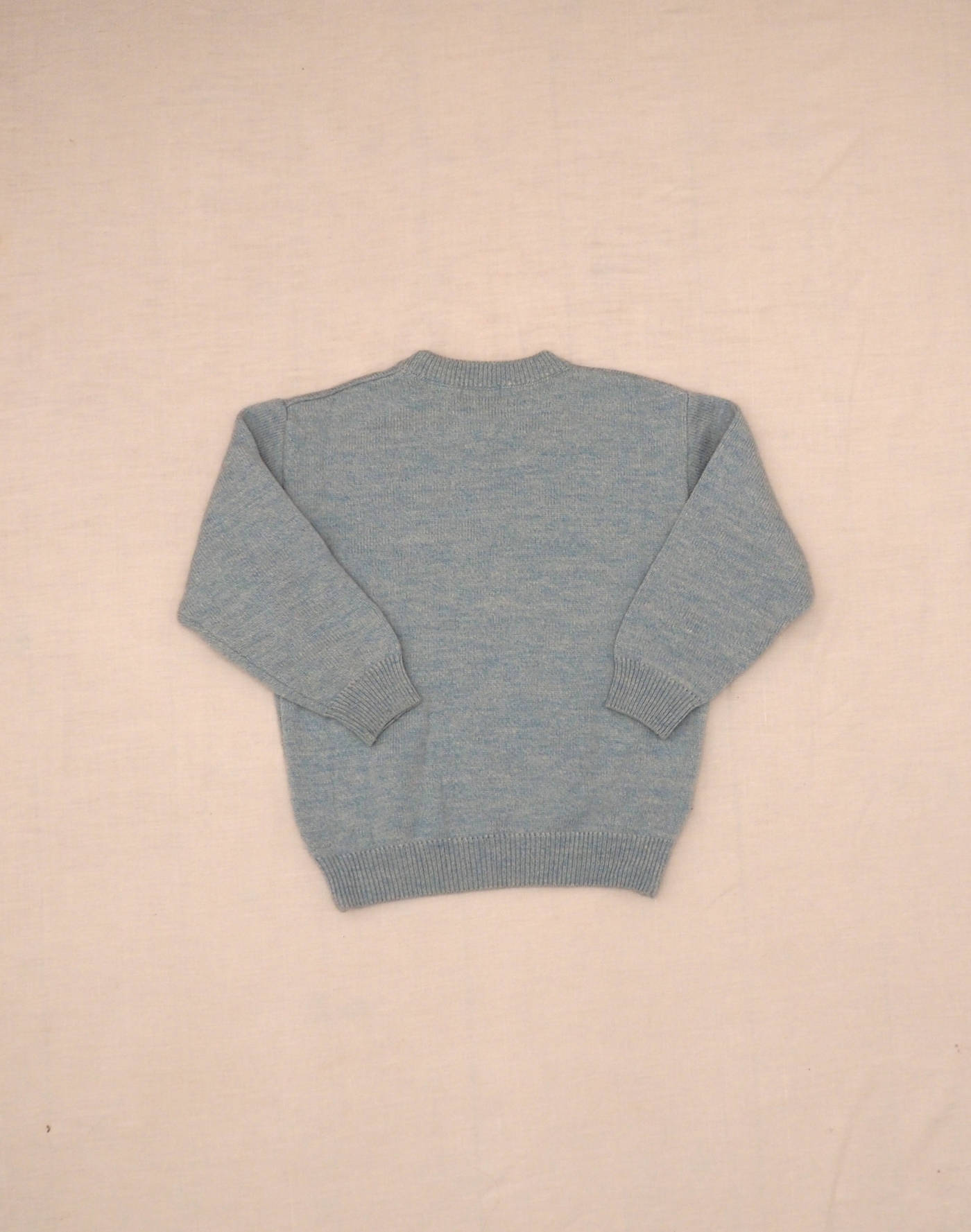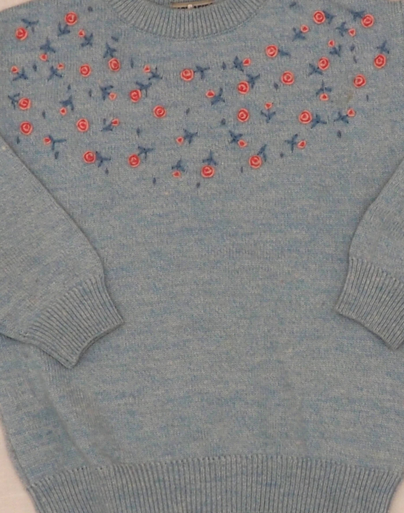 Size 6 years. Beautiful round-neck sweater in very soft light-blue knit, embroidered with pink flowers on the bust. Very good condition, knit 50% cotton, 50% acrylic, made in Italy.