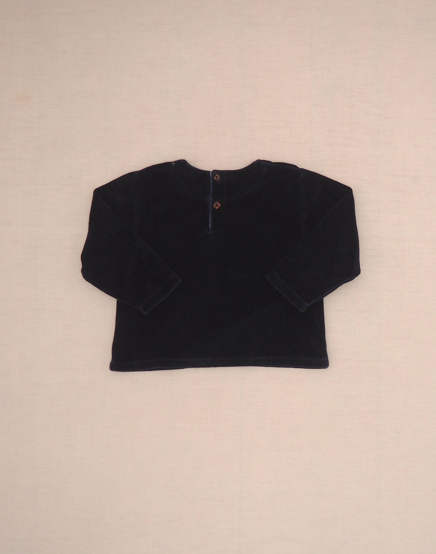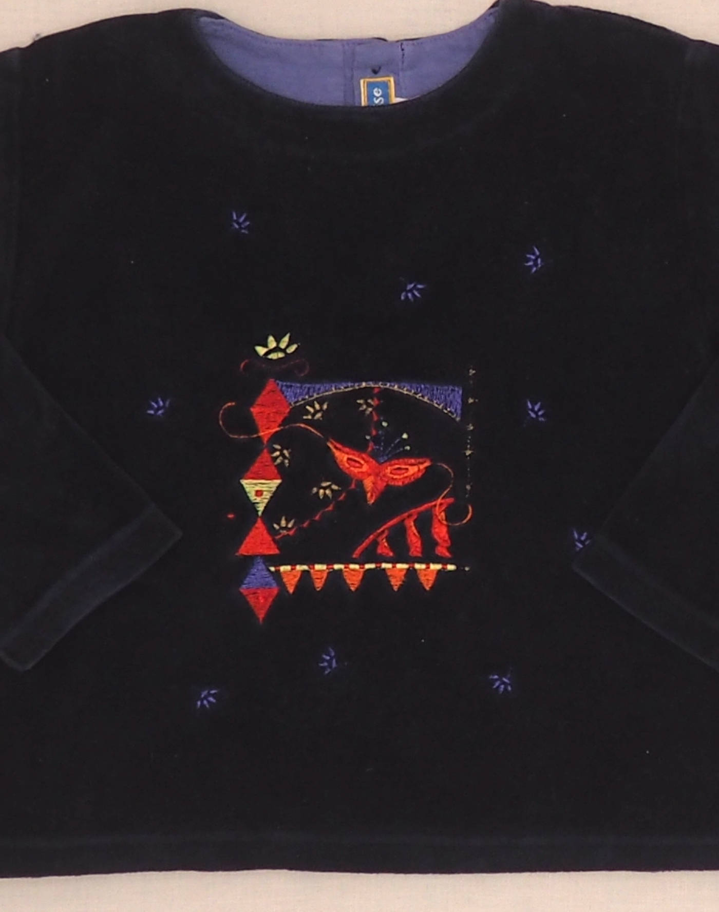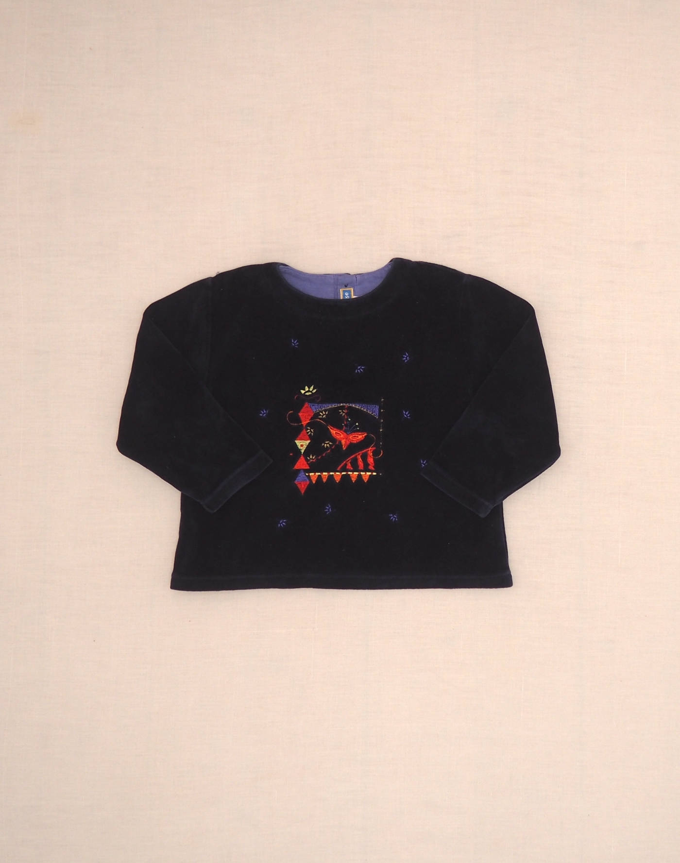Beautiful navy blue velvet sweatshirt, embroidered on the bust, long sleeves, closed in the back with two buttons. Very good condition, fabric 81% cotton, 19% polyester.