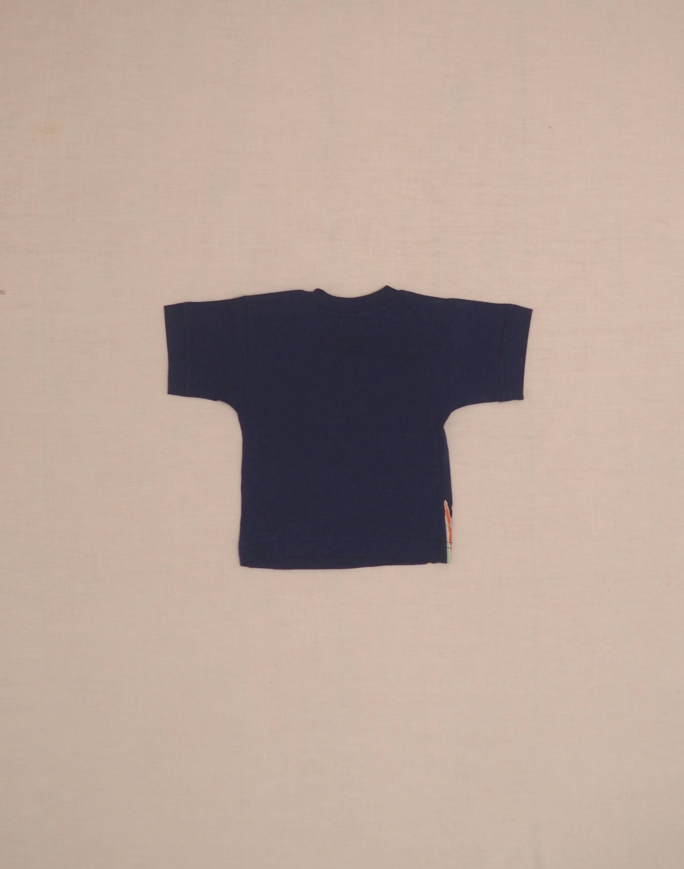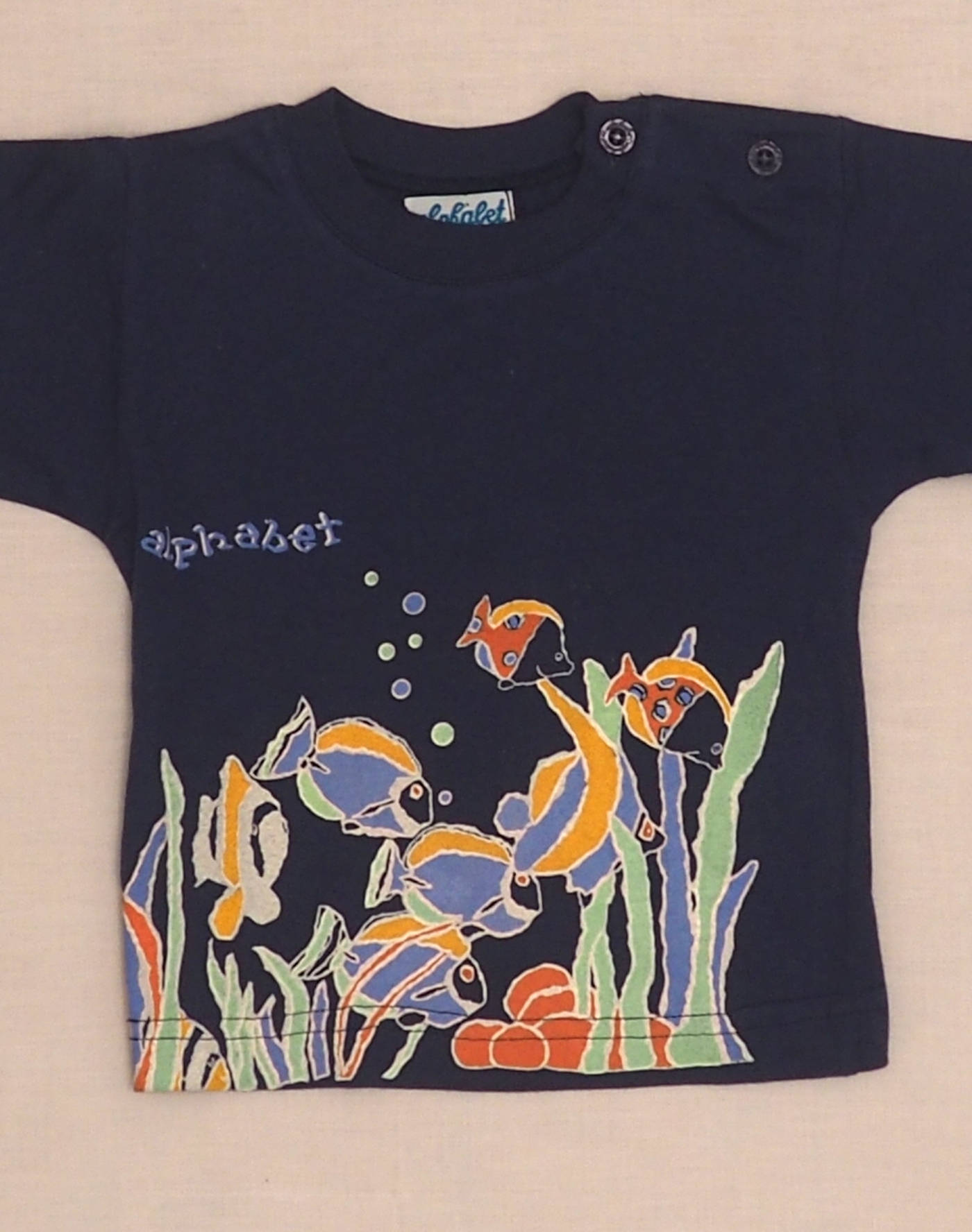 Beautiful blue T-shirt with multicolored fish print, short sleeves, closed at the shoulder with two buttons. Very good condition, 100% cotton.