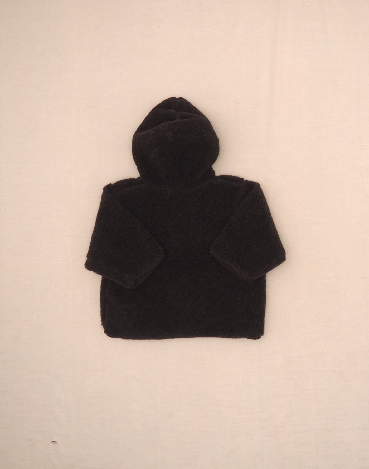 Adorable mottled brown fleece jacket with hedgehog patch on bust, lined hood in checked fabric, closed with three horn-effect buttons. Very good condition, 52% polyester, 48% acrylic fleece.