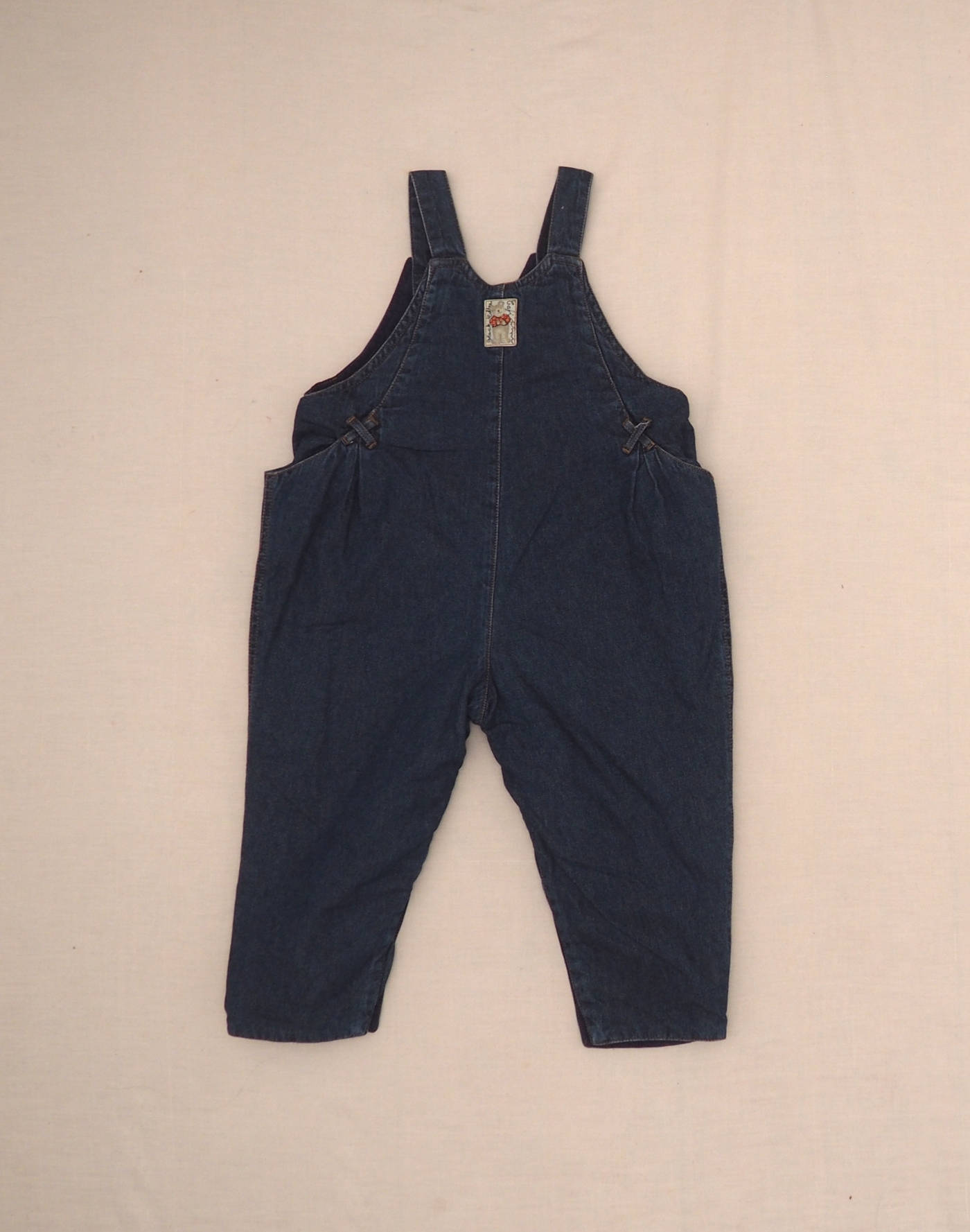 Super fleece denim dungarees, embroidered with a bear on one side, two front pockets with nice stitching details, straps fastened with two front buttons, closed with five wooden buttons, eight snaps at crotch. Very good condition, 100% cotton fabric, polyester fleece.