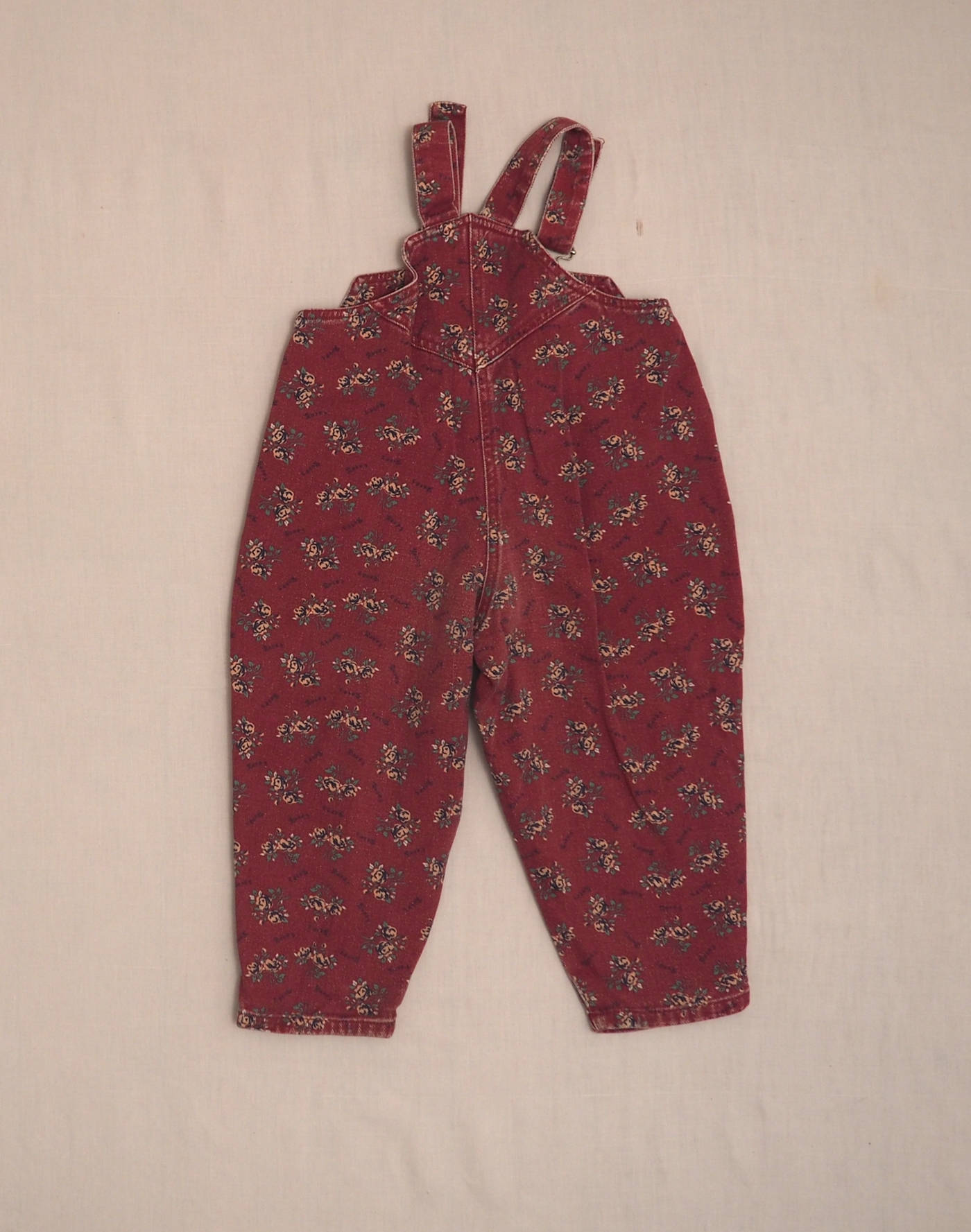 All-terrain dungarees in mottled burgundy with floral motif, adjustable straps fastened with two rivets at front, two rivets to close at waist. Two front pockets. Good condition but slightly faded print, hence low price, 100% cotton.
