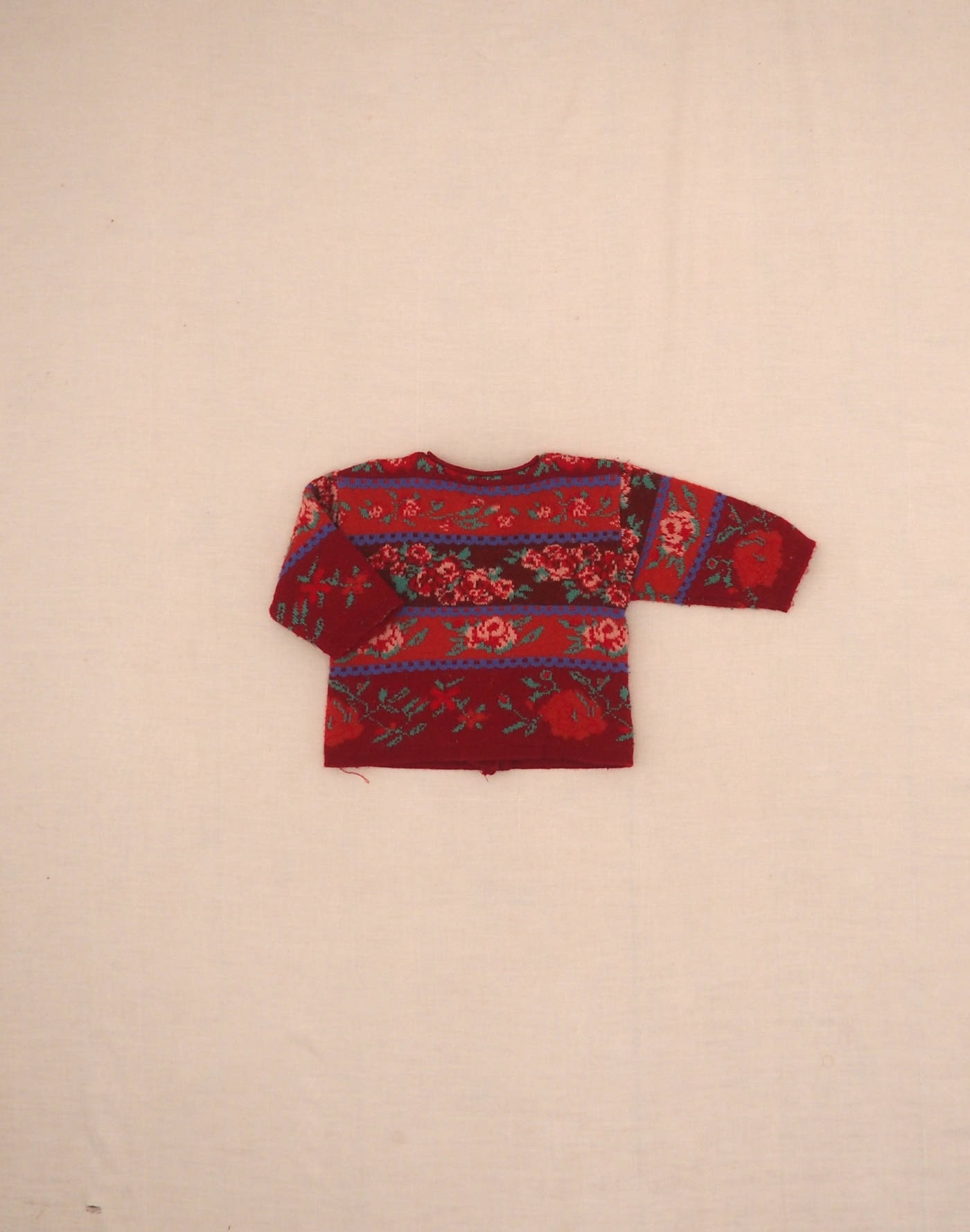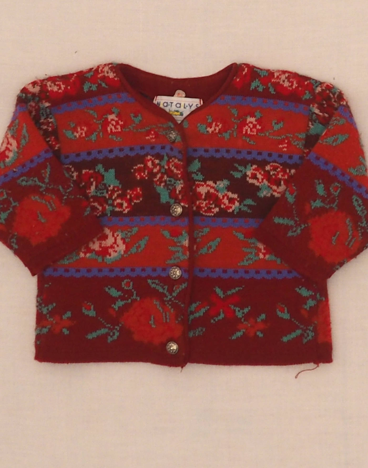 Lovely cardigan in floral jacquard knit, fastened with four engraved metal buttons. Made in France, very good condition, knitwear 70% acrylic, 30% wool.
