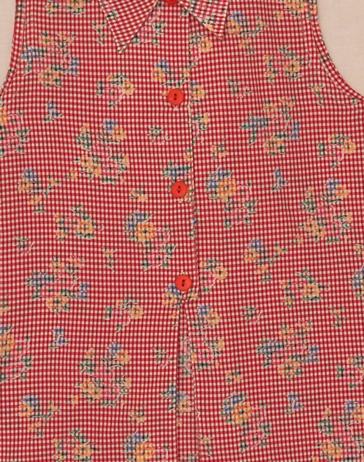 Size 8-10 years. Pretty sleeveless tunic in red floral gingham, slits on sides, closed with four buttons. Very good condition, no composition label.