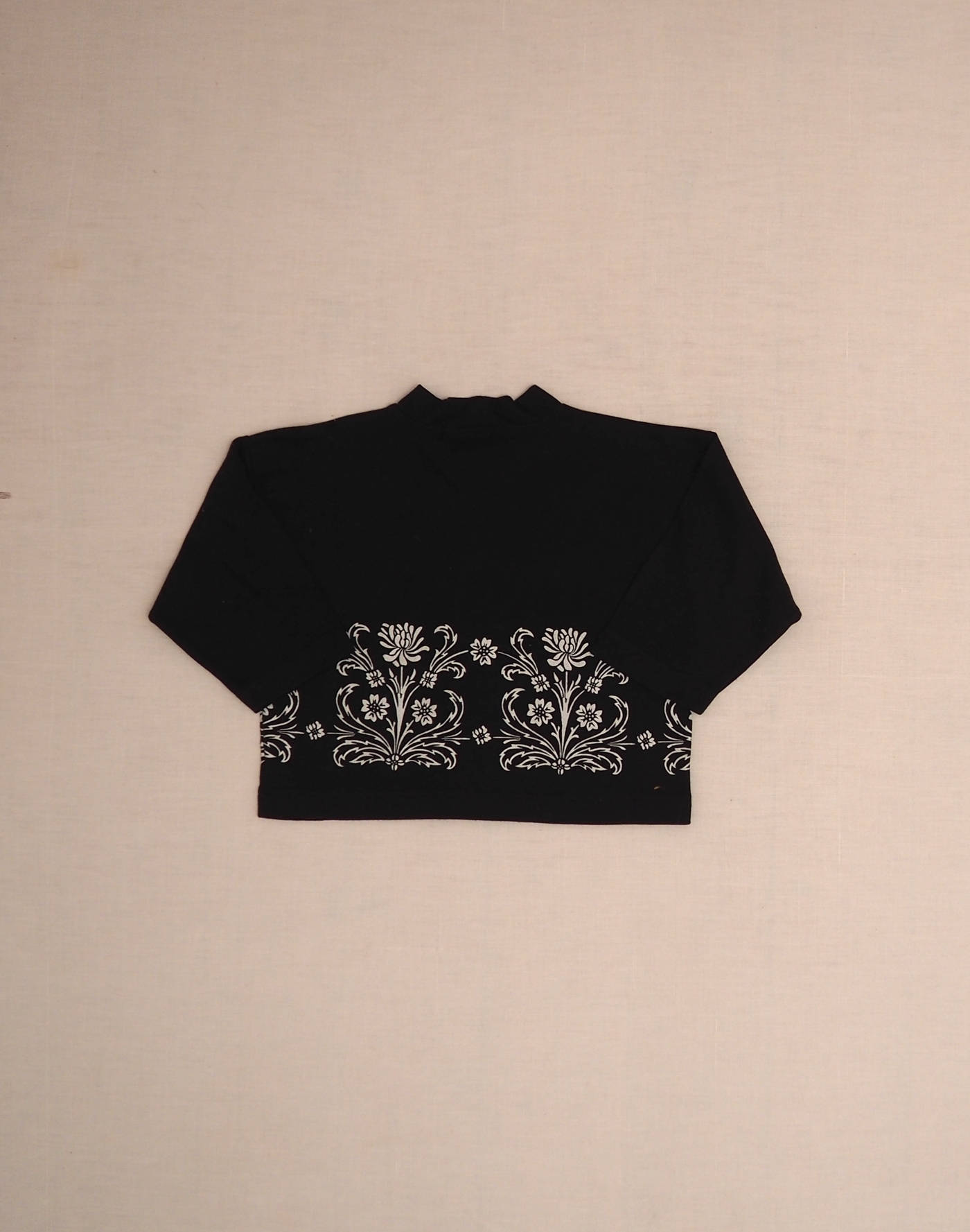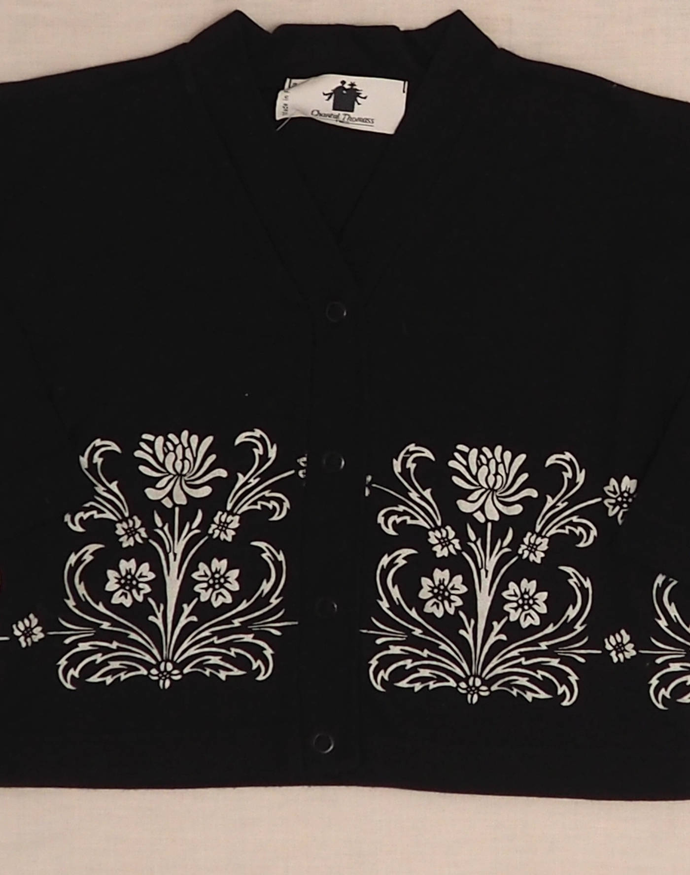 Very chic cardigan in soft black jersey, with white floral fringe around the waist. Closed with four snap buttons. Made in France, mint condition with label, 100% cotton.