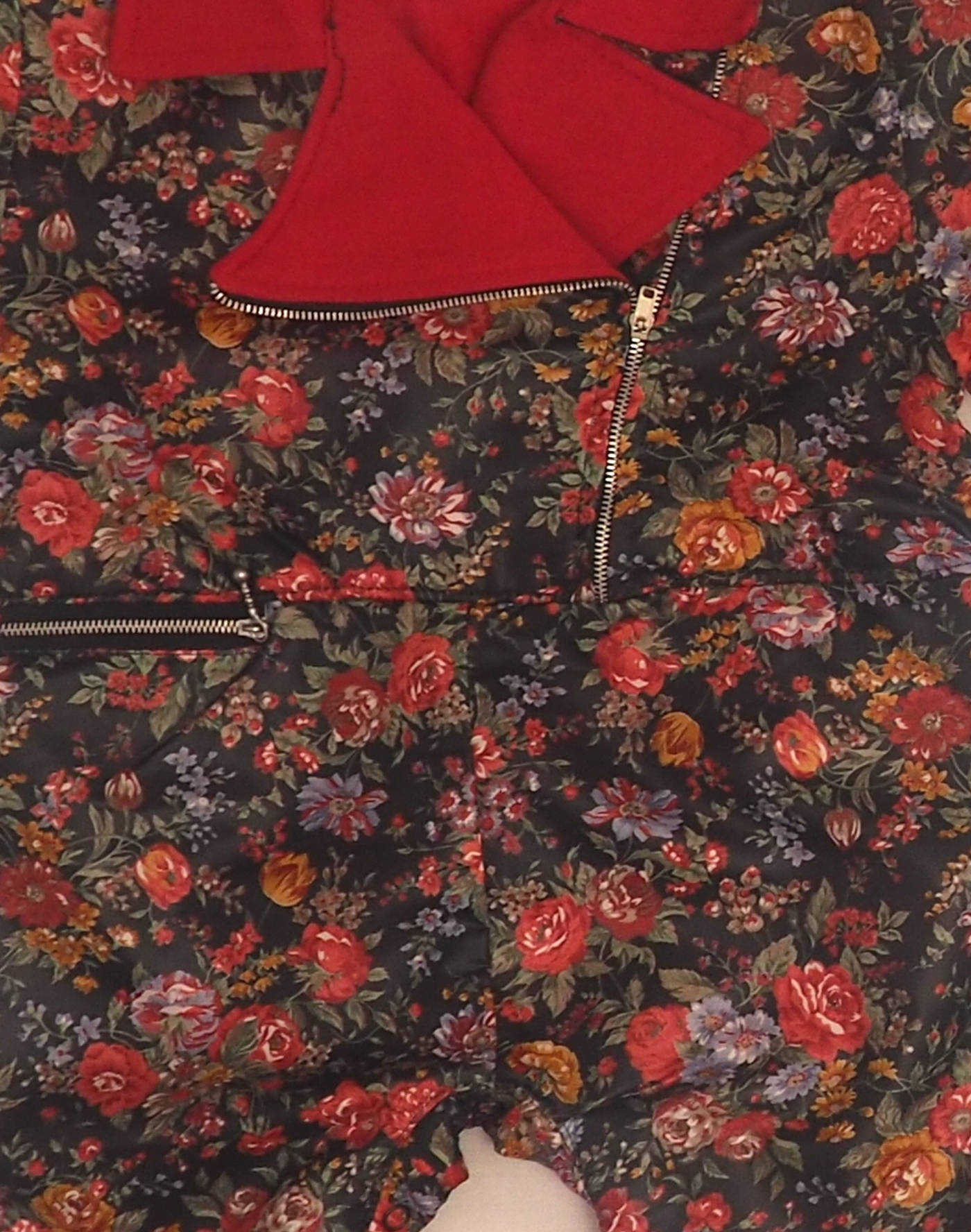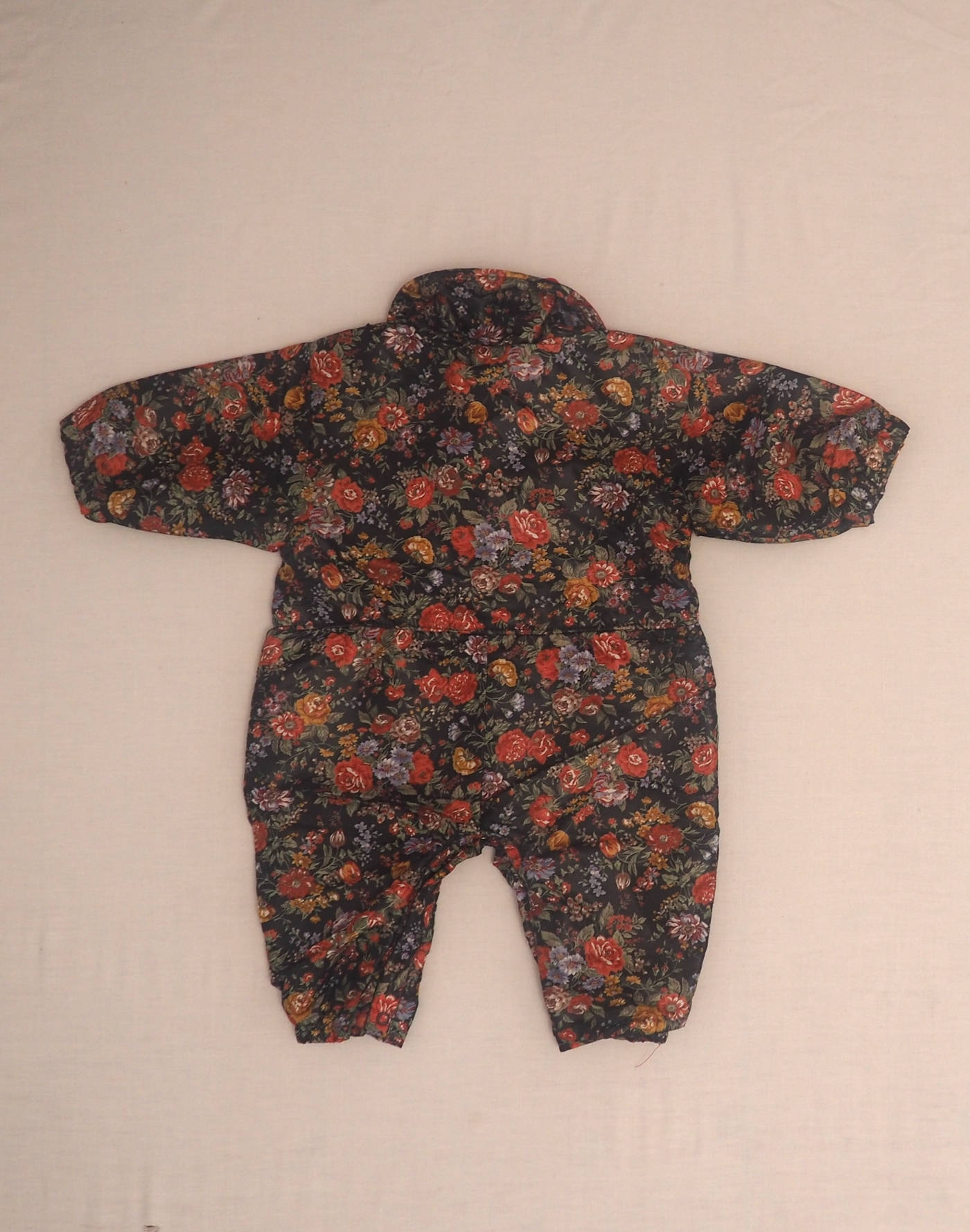 Incredible floral fleece winter jumpsuit with perfecto collar, red jersey lining, elasticated cuffs and ankles. Small zipped front pocket. Made in France, very good condition, polyester outer fabric, 50% cotton, 50% polyester lining. Indicated for 18 months, but corresponds more closely to a 12-month garment.
