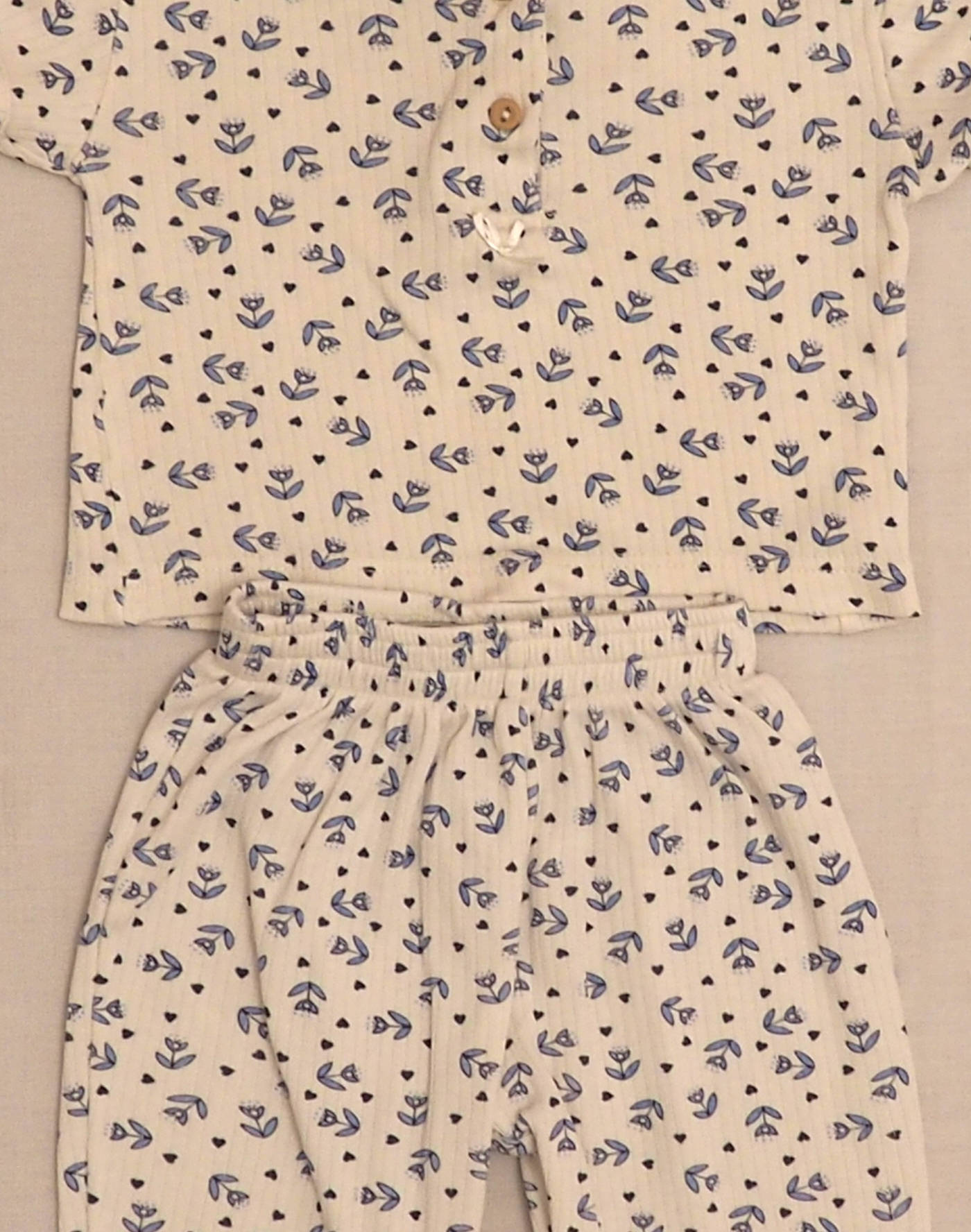 Beautiful ensemble in white ribbed jersey with small blue flower motif, comprising a short-sleeved T-shirt, collar fastened with two buttons, small bow on the neckline, and matching pants with elastic waistband. Very good condition, 100% cotton.