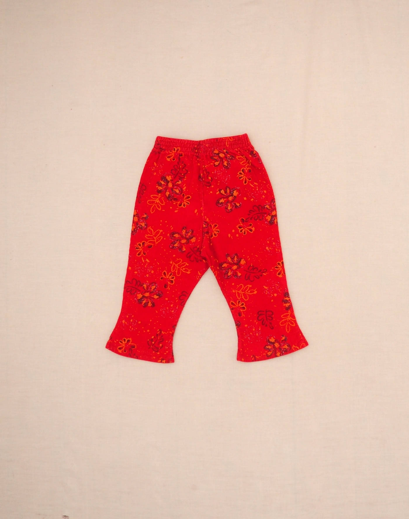 Cute, finely ribbed red velvet pants with floral print, elastic waistband and slightly flared leg. Very good condition, 100% cotton.