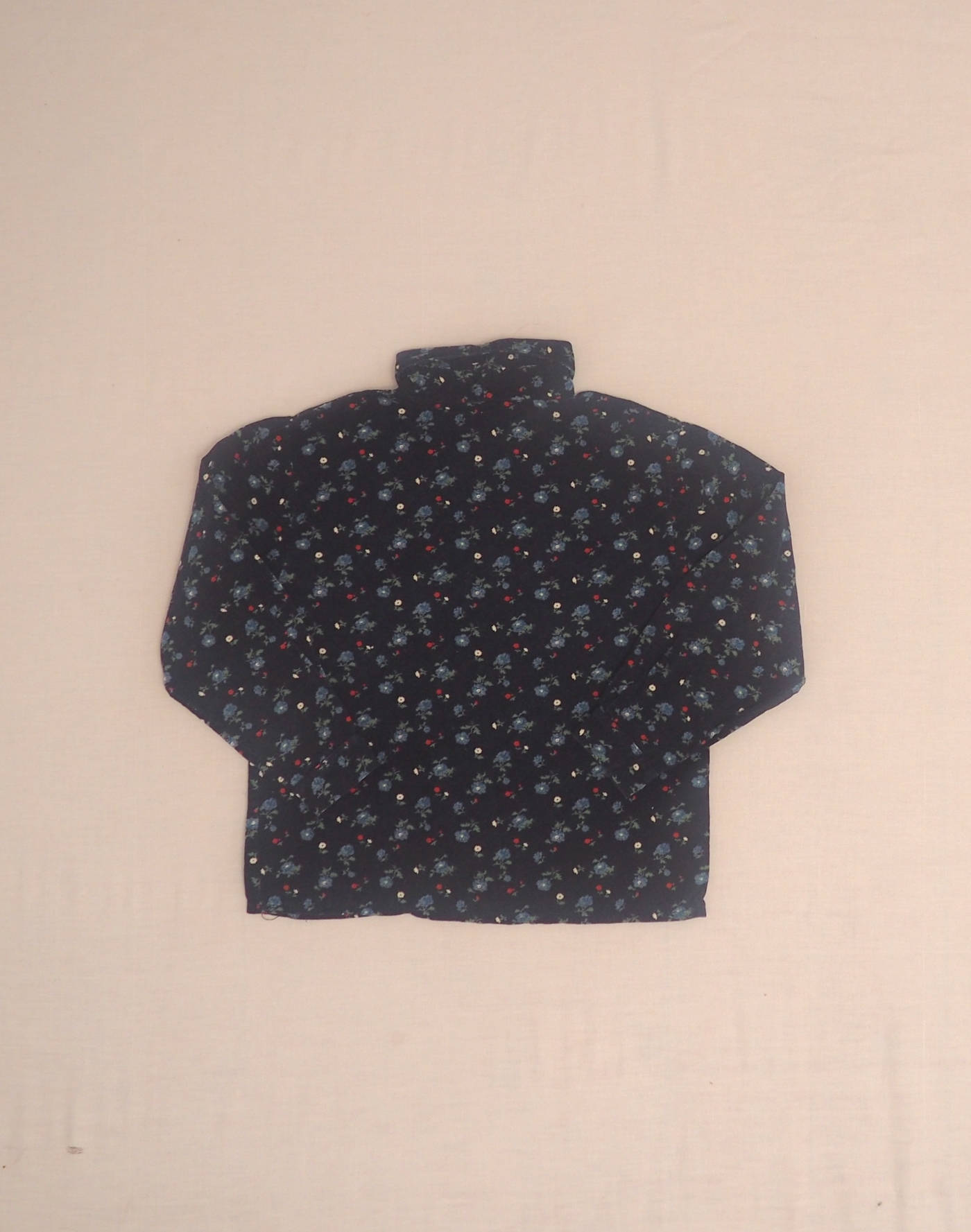 Fine navy blue corduroy shirt with small flower motif. Buttoned sleeves and collar, fastened with five buttons. No composition label, but cotton feel.