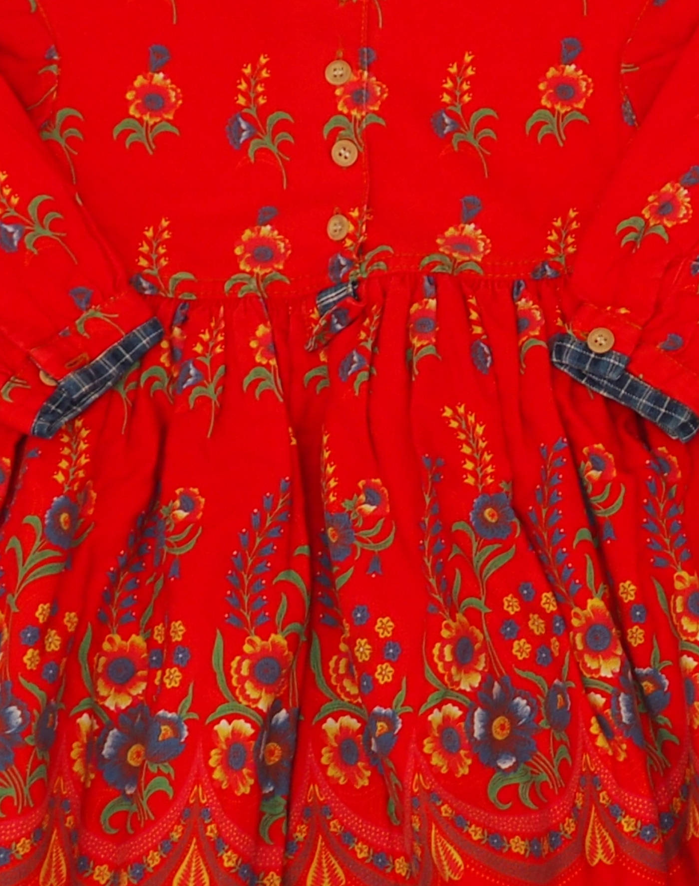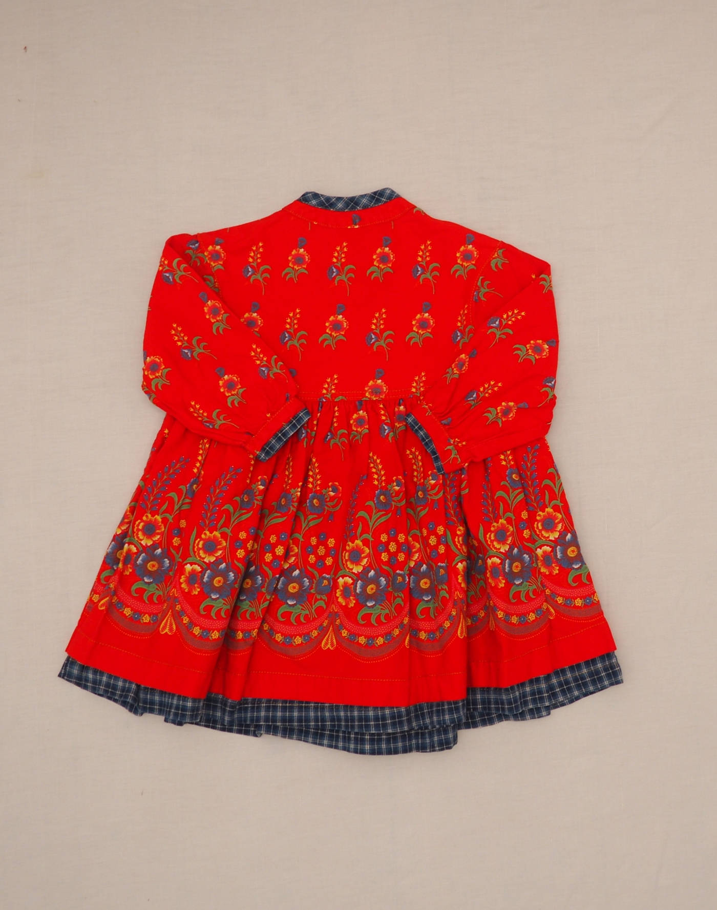 Magnificent red winter dress with floral motifs, long buttoned sleeves, blue plaid lined underskirt, pleated at the waist, closed in front with five wooden buttons. Very good condition, 100% cotton, made in Tunisia.