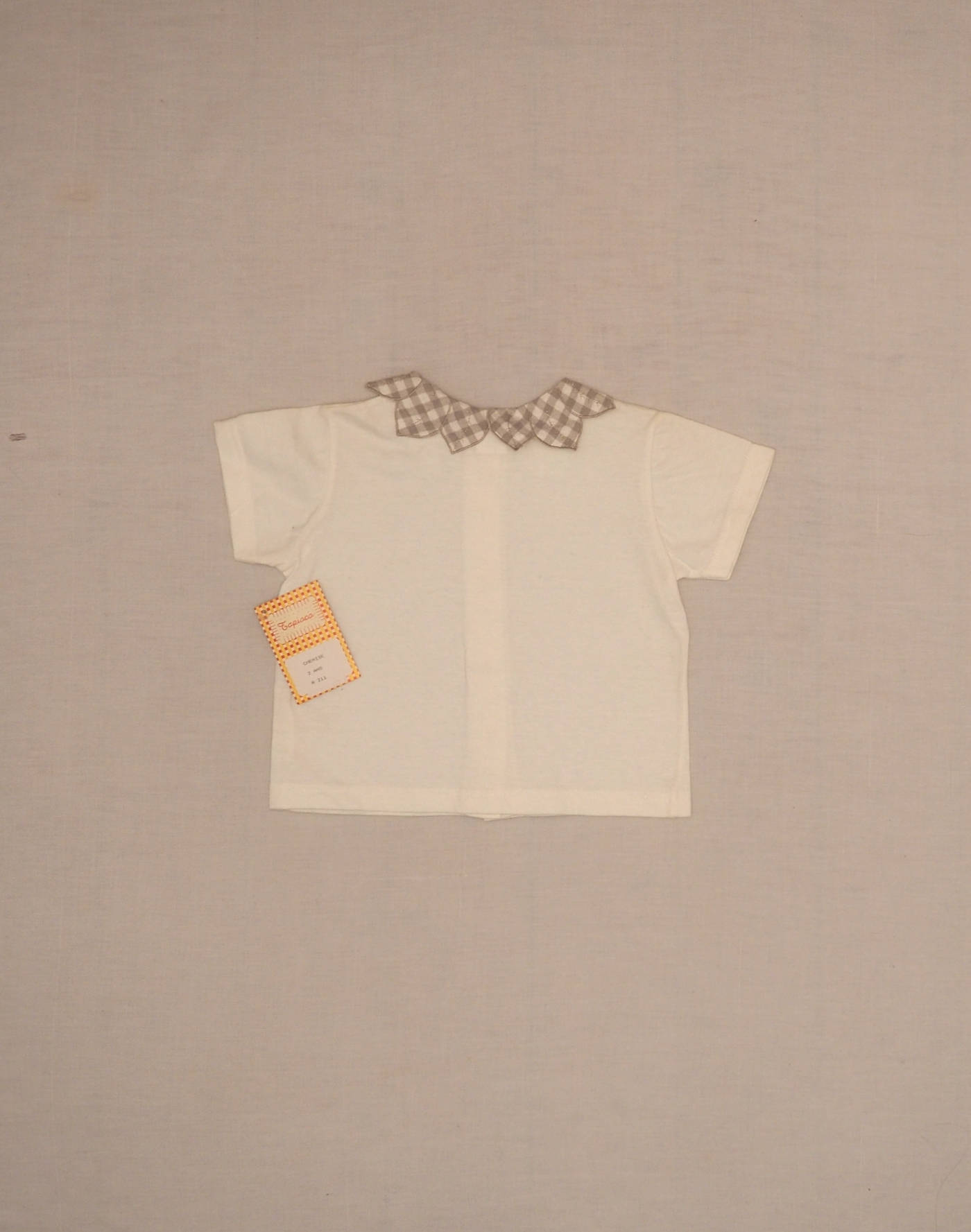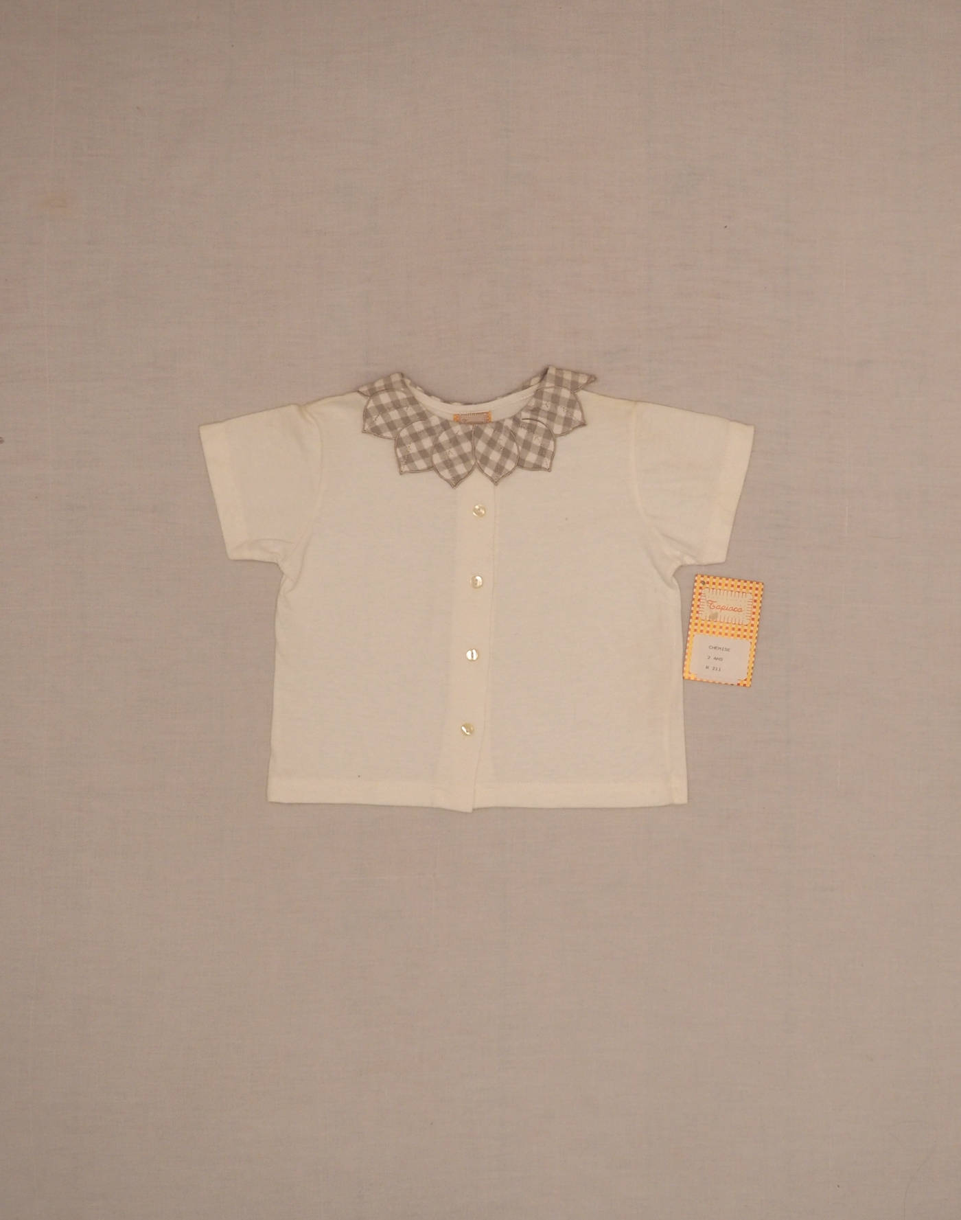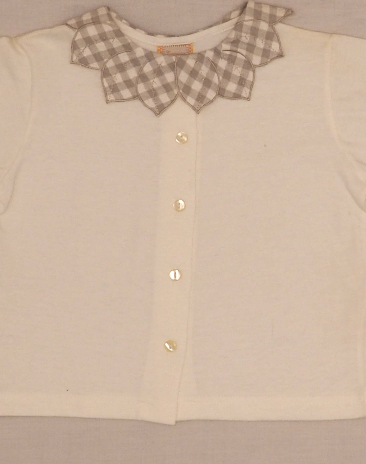 Adorable white jersey blouse with gray gingham collar embroidered in the shape of a flower. Closed with five pearly buttons. Made in Europe, very good condition, 100% cotton.