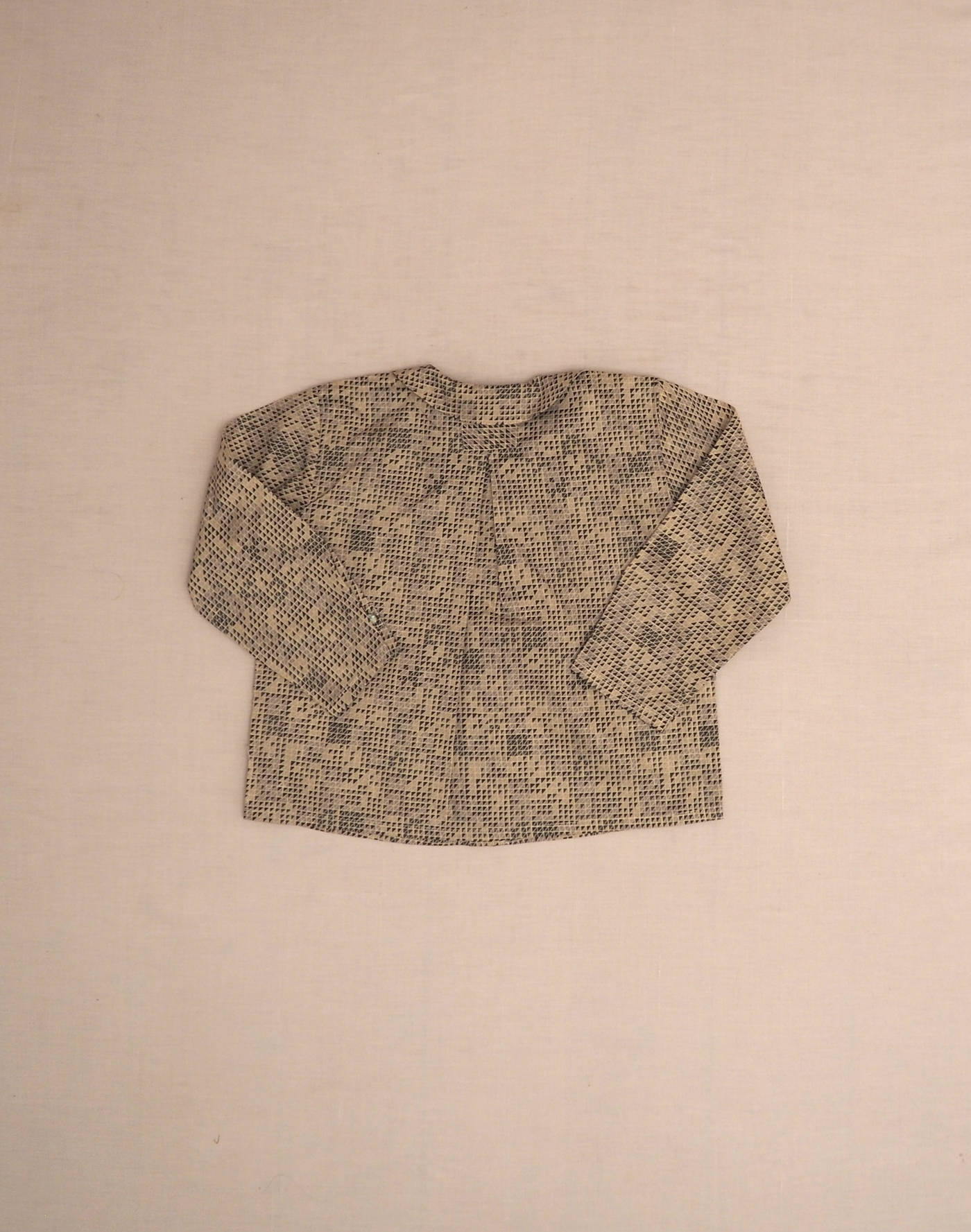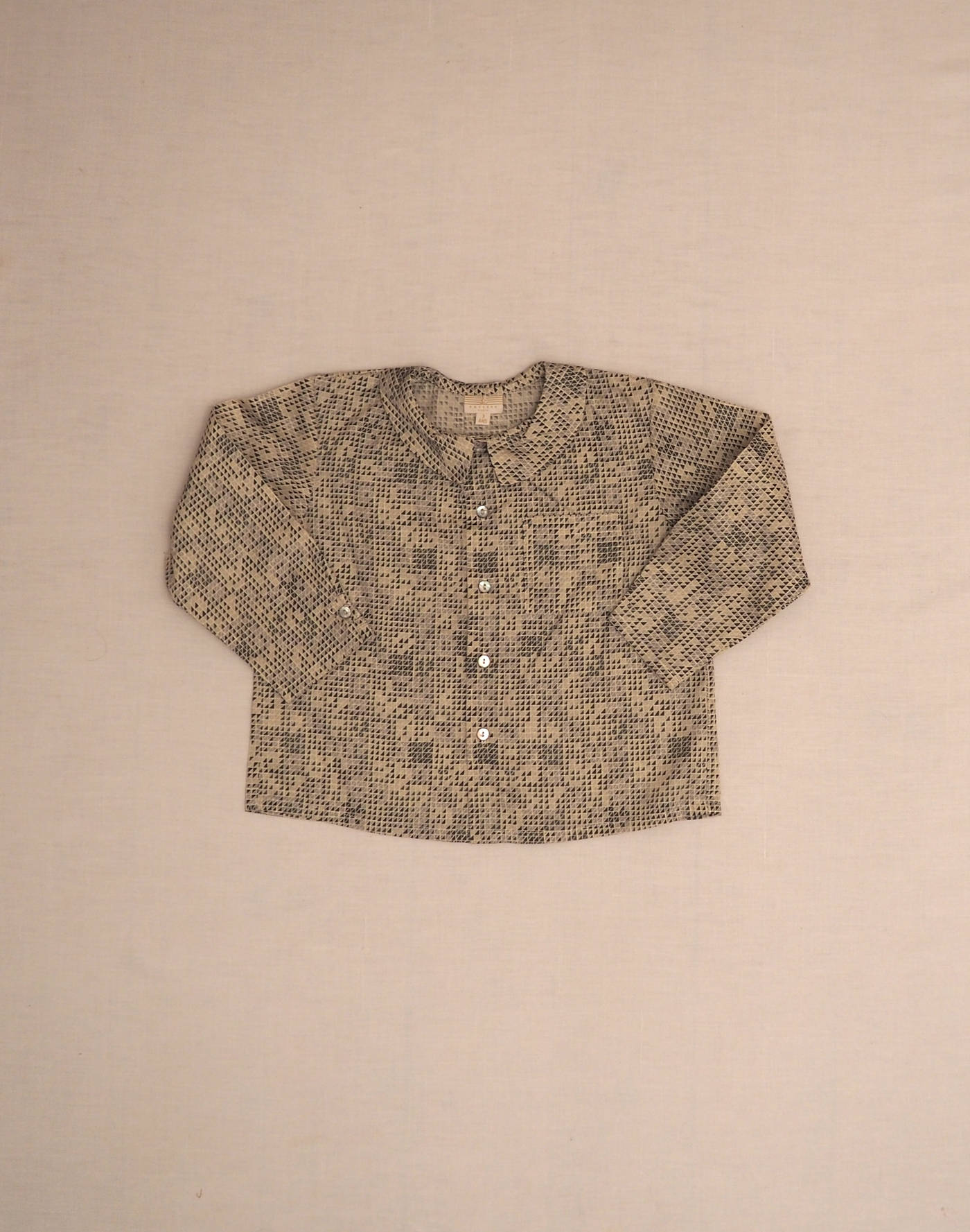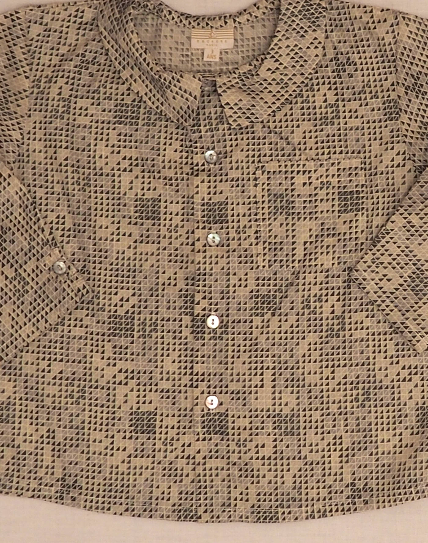 Baghère by Sylvie Loussier, from an exceptional new stock of the children’s couture brand. Beautiful long-sleeved shirt in light Liberty with triangles motif, one chest pocket, closed with five mother-of-pearl buttons. One clip on the back. Made in France, mint condition, 100% cotton.