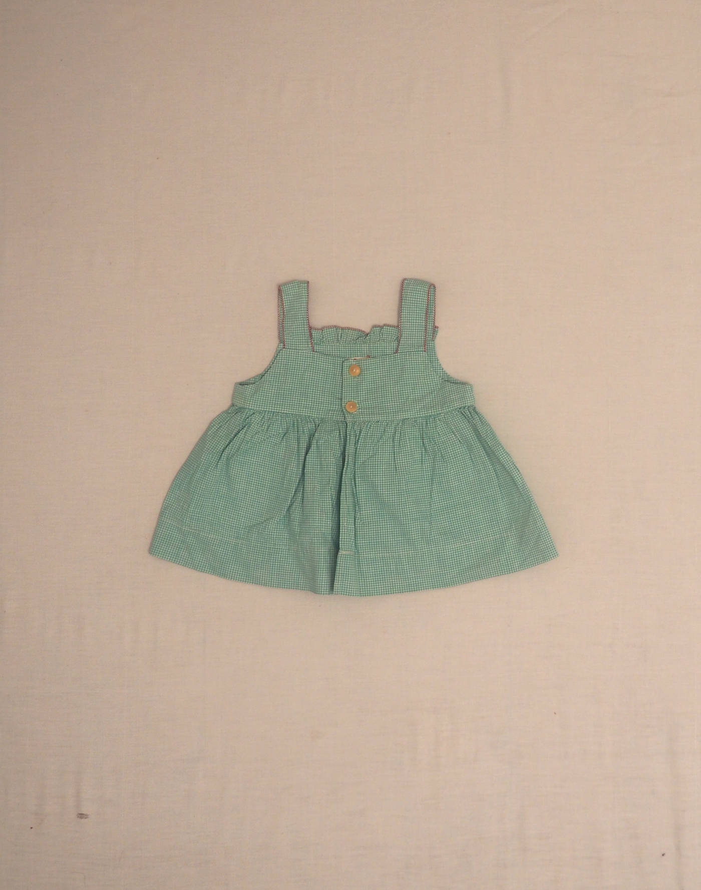 1950s. Charming blouse (buttoned only at the top of the back) in green gingham embroidered with little characters playing with flowers and… poodles? Embroidered ruffle on collar and pockets, pleated at waist, closed at back with two buttons. Made in France, very good condition, cotton feel.