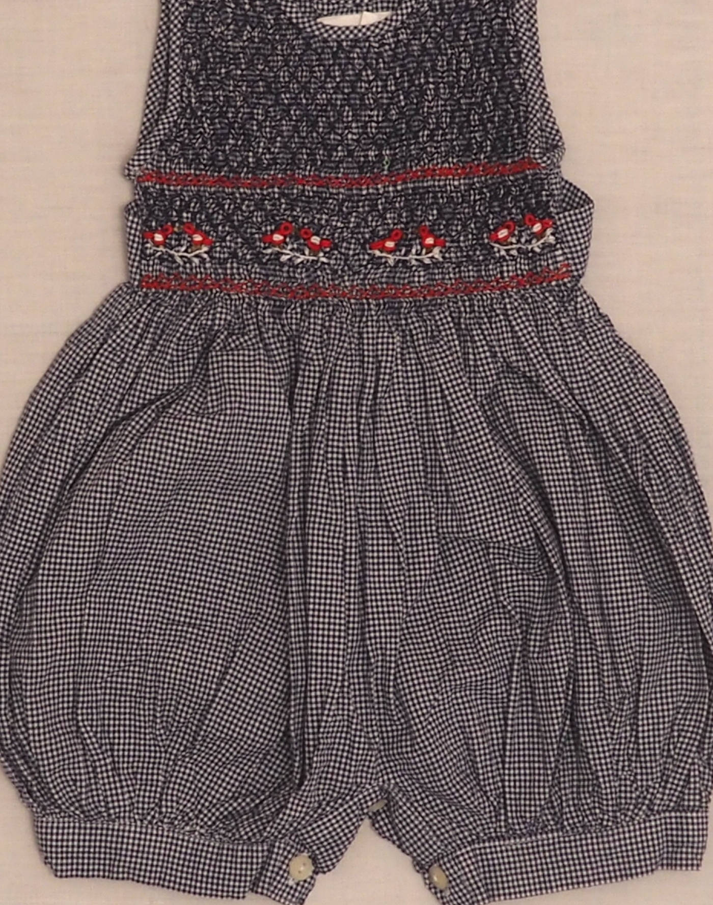 Charming romper in navy blue gingham with smocking on the bust, hand-embroidered with little red birds. Three-button back closure, three buttons at crotch, buttoned strap. Very good condition, 100% cotton, made in Madagascar.