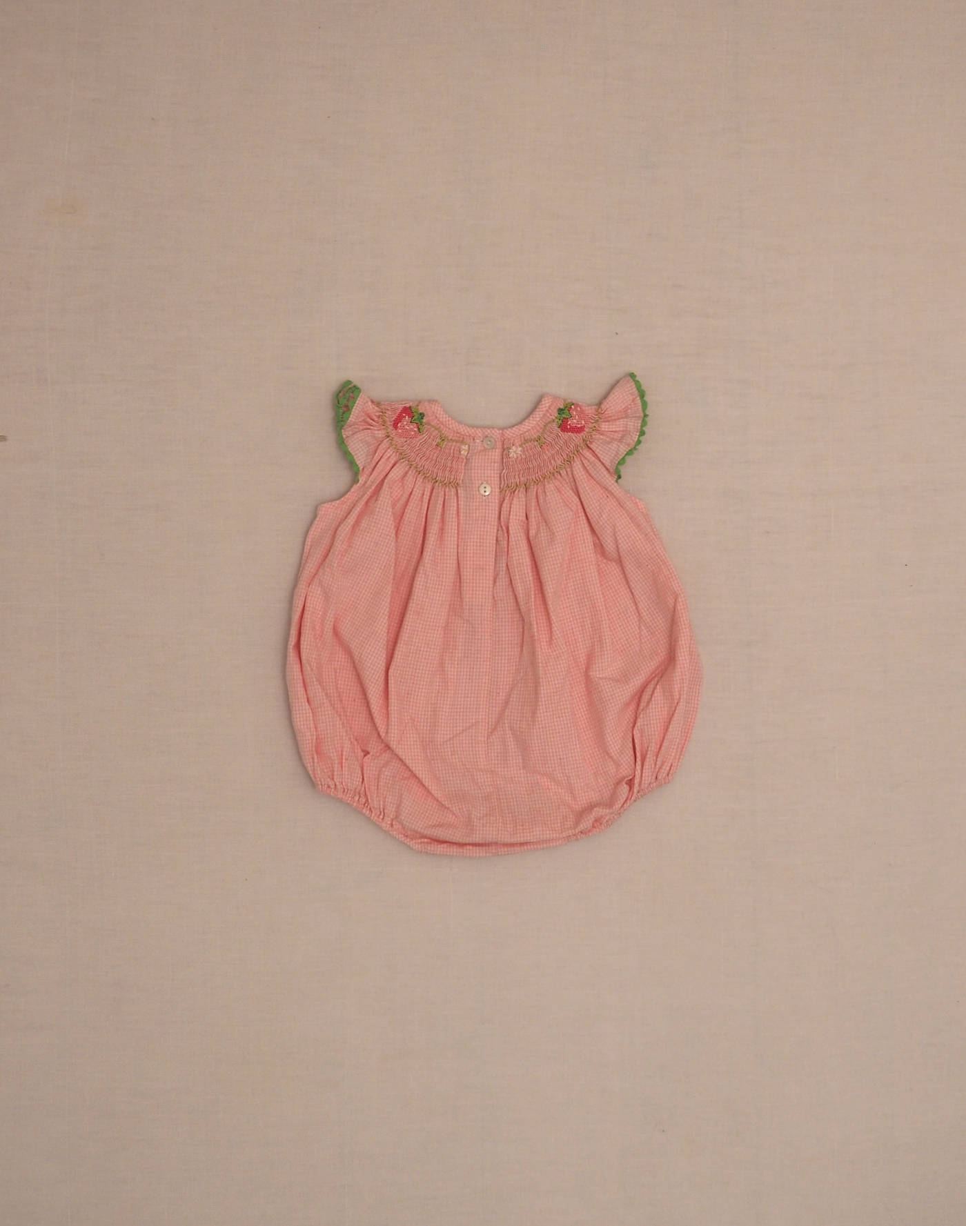 Charming pink gingham romper with hand-embroidered smocking around the shoulders, green croquet on the sleeve flounce, closed in the back with two buttons, three buttons at the crotch. Very good condition, fabric 55% cotton, 45% polyester, made in El Salvador.