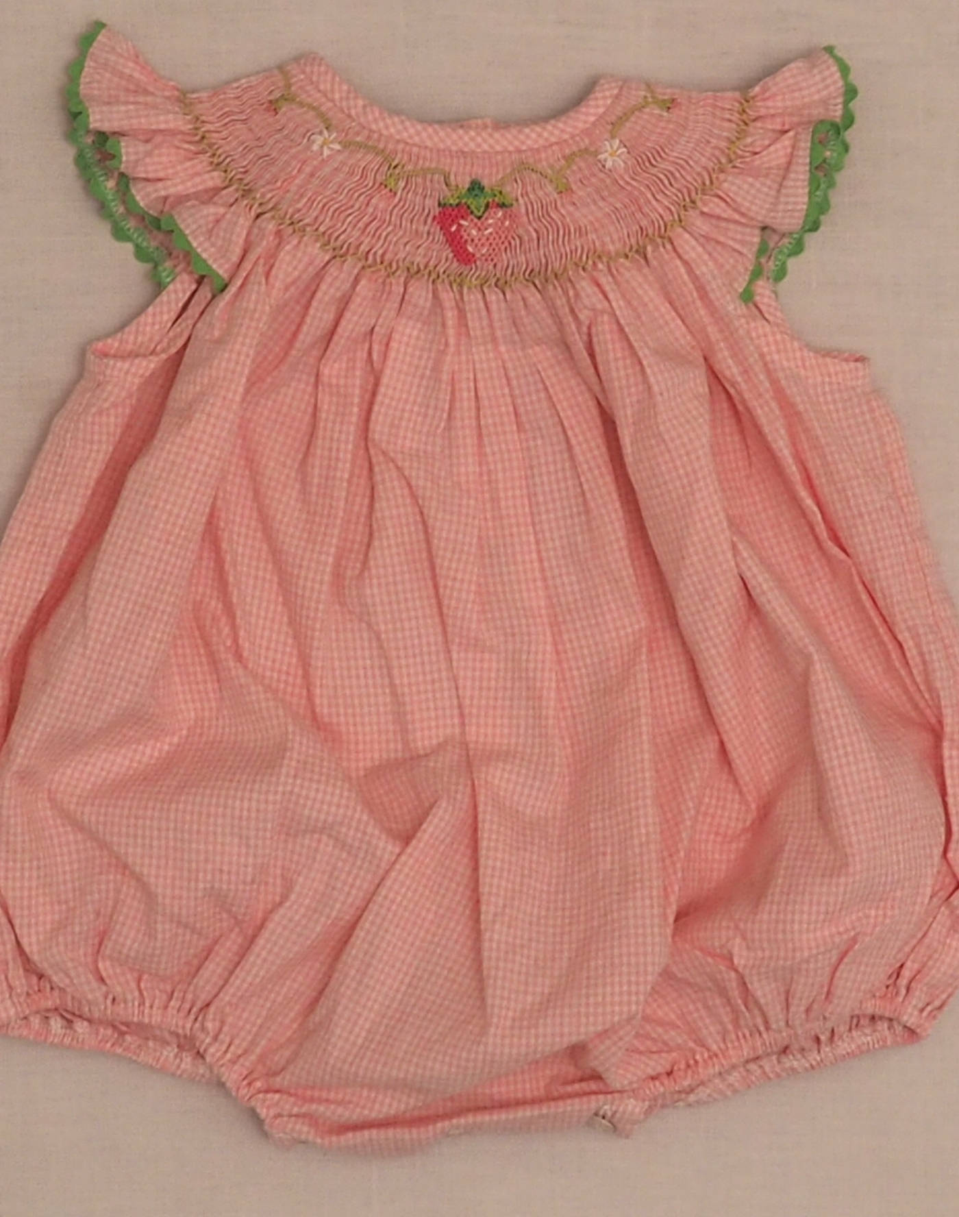 Charming pink gingham romper with hand-embroidered smocking around the shoulders, green croquet on the sleeve flounce, closed in the back with two buttons, three buttons at the crotch. Very good condition, fabric 55% cotton, 45% polyester, made in El Salvador.