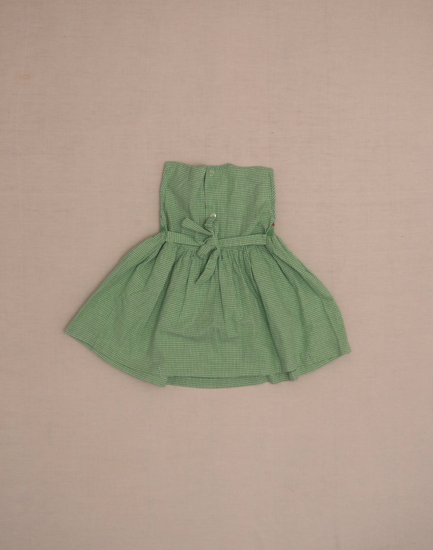 Handcrafted piece, hand-embroidered smock. Lovely green gingham dress with multicolored embroidery on the bust, fastened in the back with two buttons and a tie strap. Very good condition, no composition label but cotton feel.