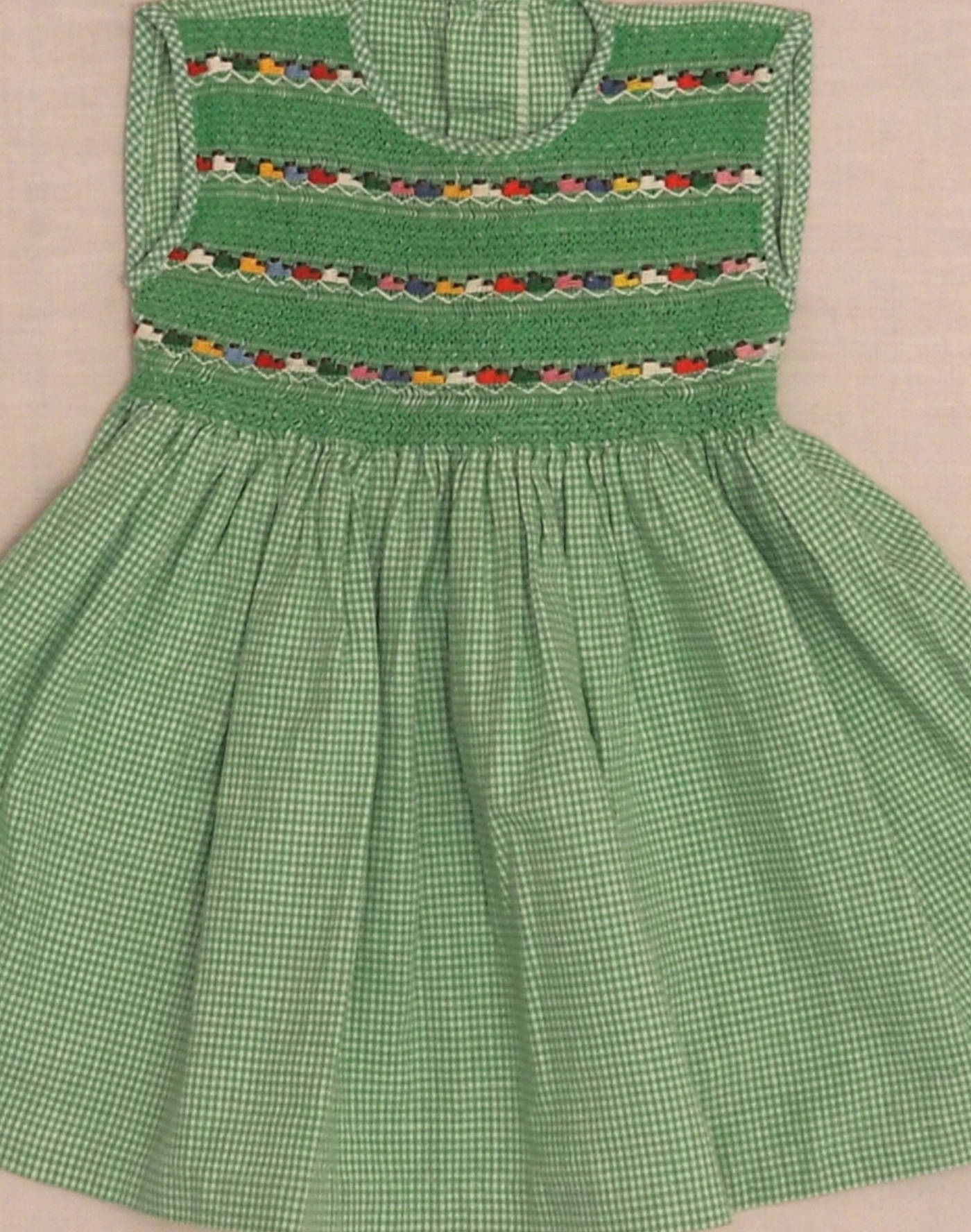 Handcrafted piece, hand-embroidered smock. Lovely green gingham dress with multicolored embroidery on the bust, fastened in the back with two buttons and a tie strap. Very good condition, no composition label but cotton feel.