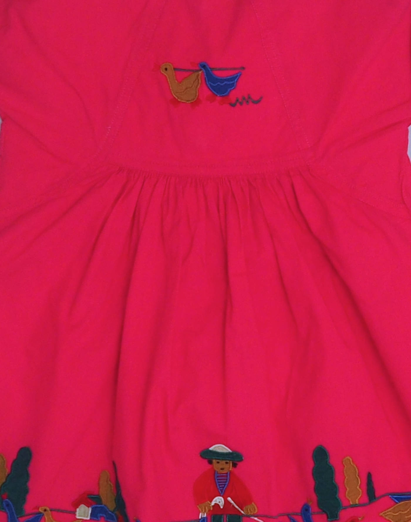 Beautiful fuchsia dress with applied geese & their guardian, short sleeves edged with madras bias, pleated at the waist, opening in the back and buttoned behind with six buttons. Very good condition, 100% cotton, made in India.