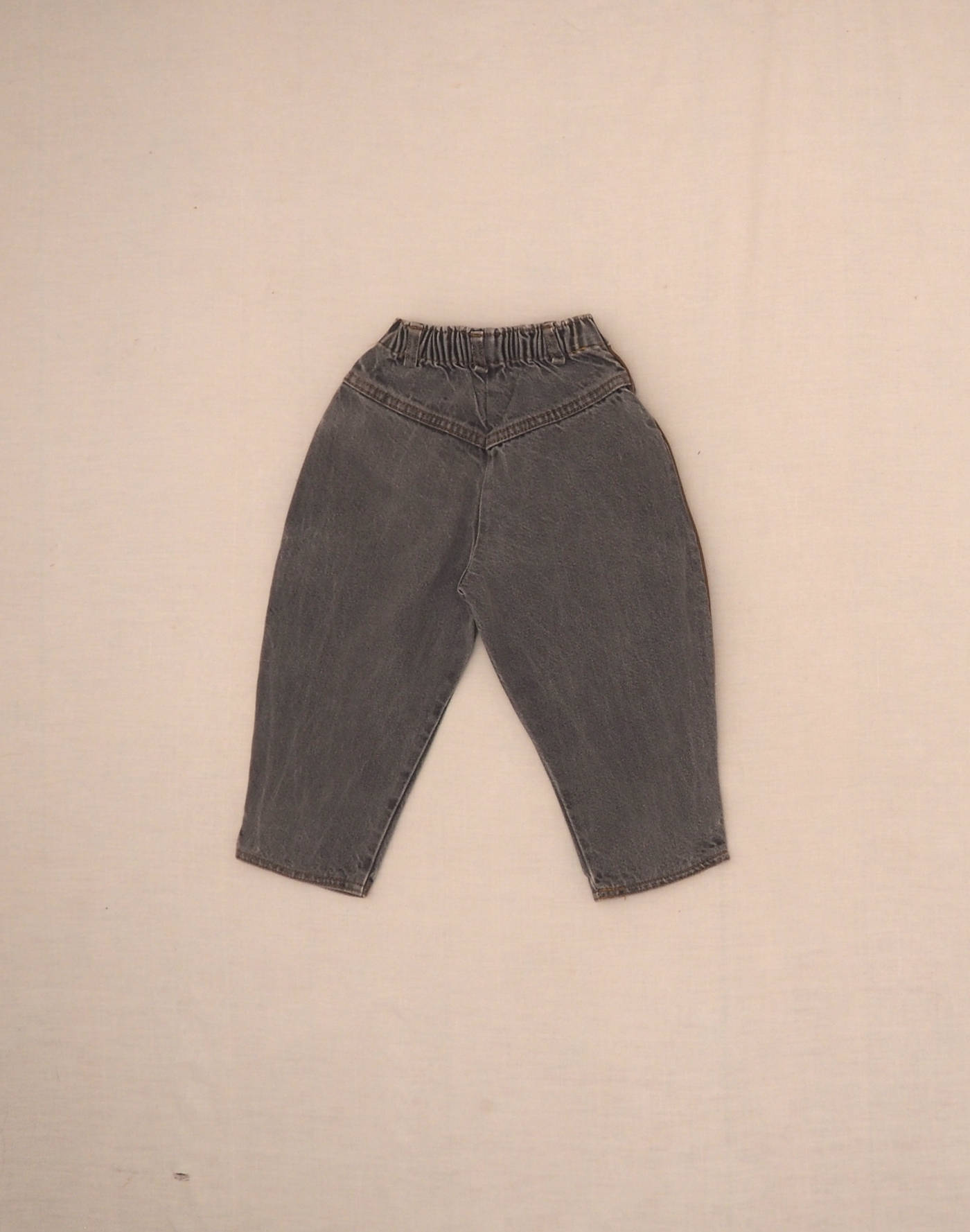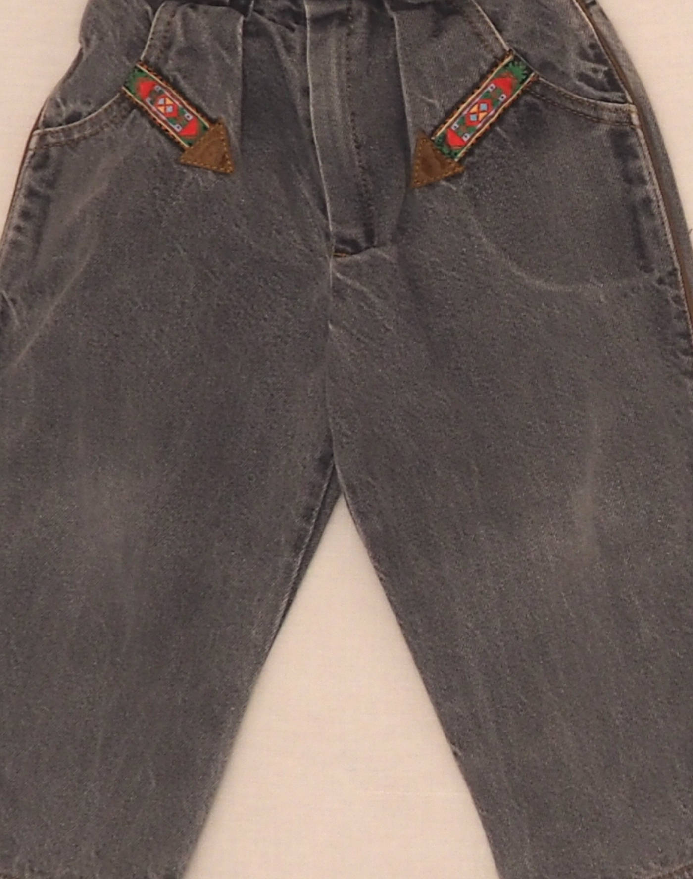 Beautiful grey jeans in a “carrot pants” cut, front pockets decorated with an embroidered ribbon, brown piping on the sides, elastic waist closed with a button and fly. Made in France, very good condition, 100% cotton.