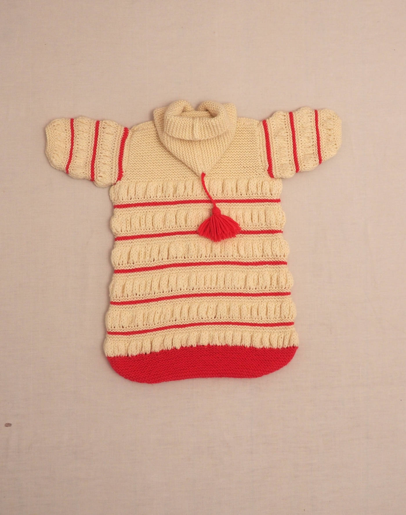 Hand-knitted piece. Magnificent hooded turbulette in ecru knit, with “doudoune” effect on body and sleeves, contrasting pink stripes, pompom on hood, closed with four large wooden buttons. Very good condition, soft wool feel.