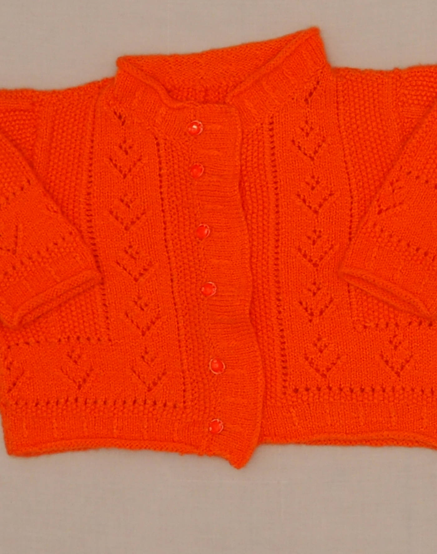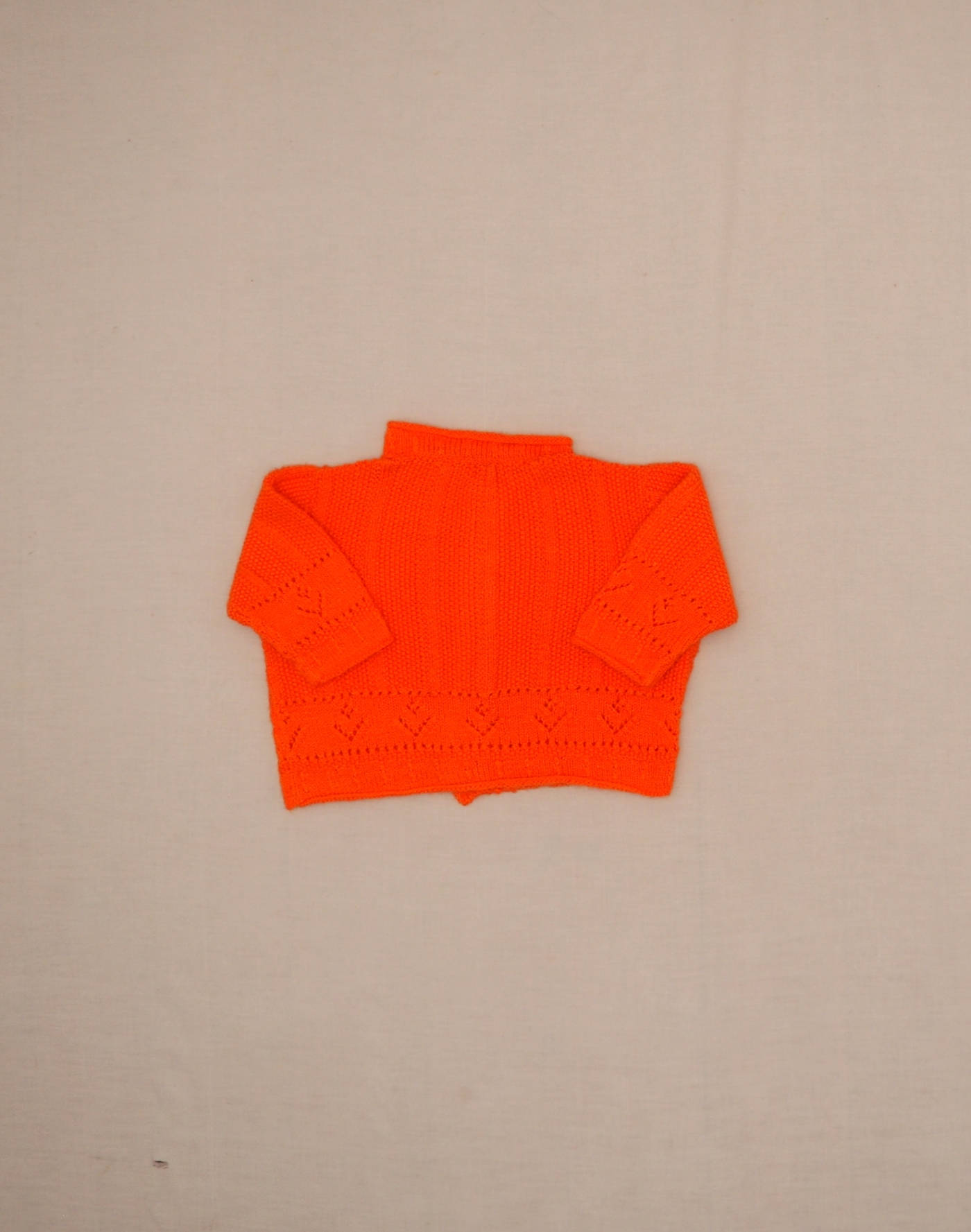 Hand-knitted piece. Beautiful orange cardigan in openwork knit, closed with six buttons. Very good condition, soft wool feel.