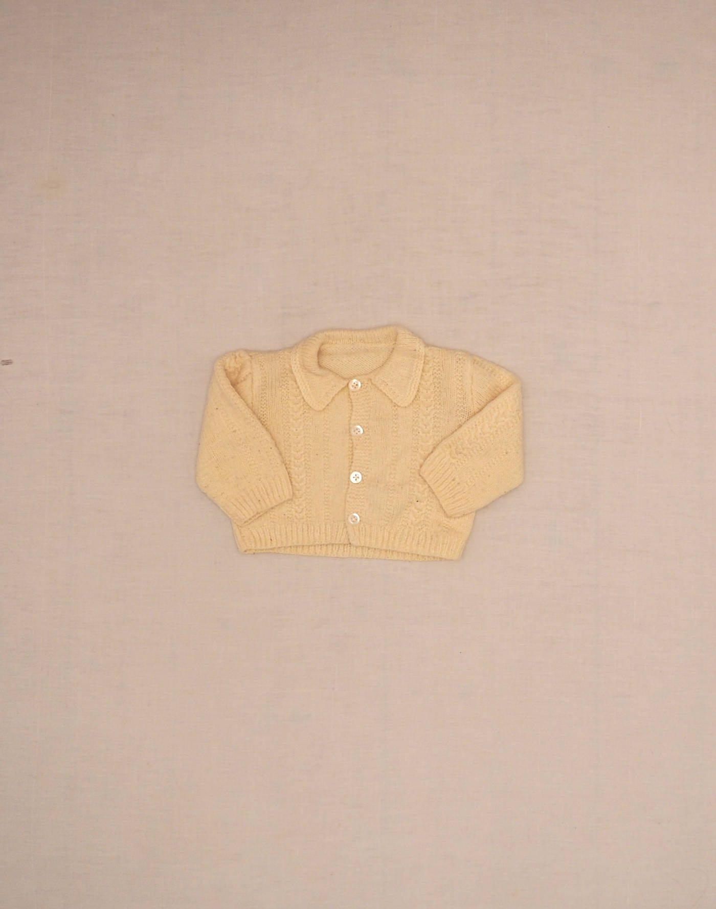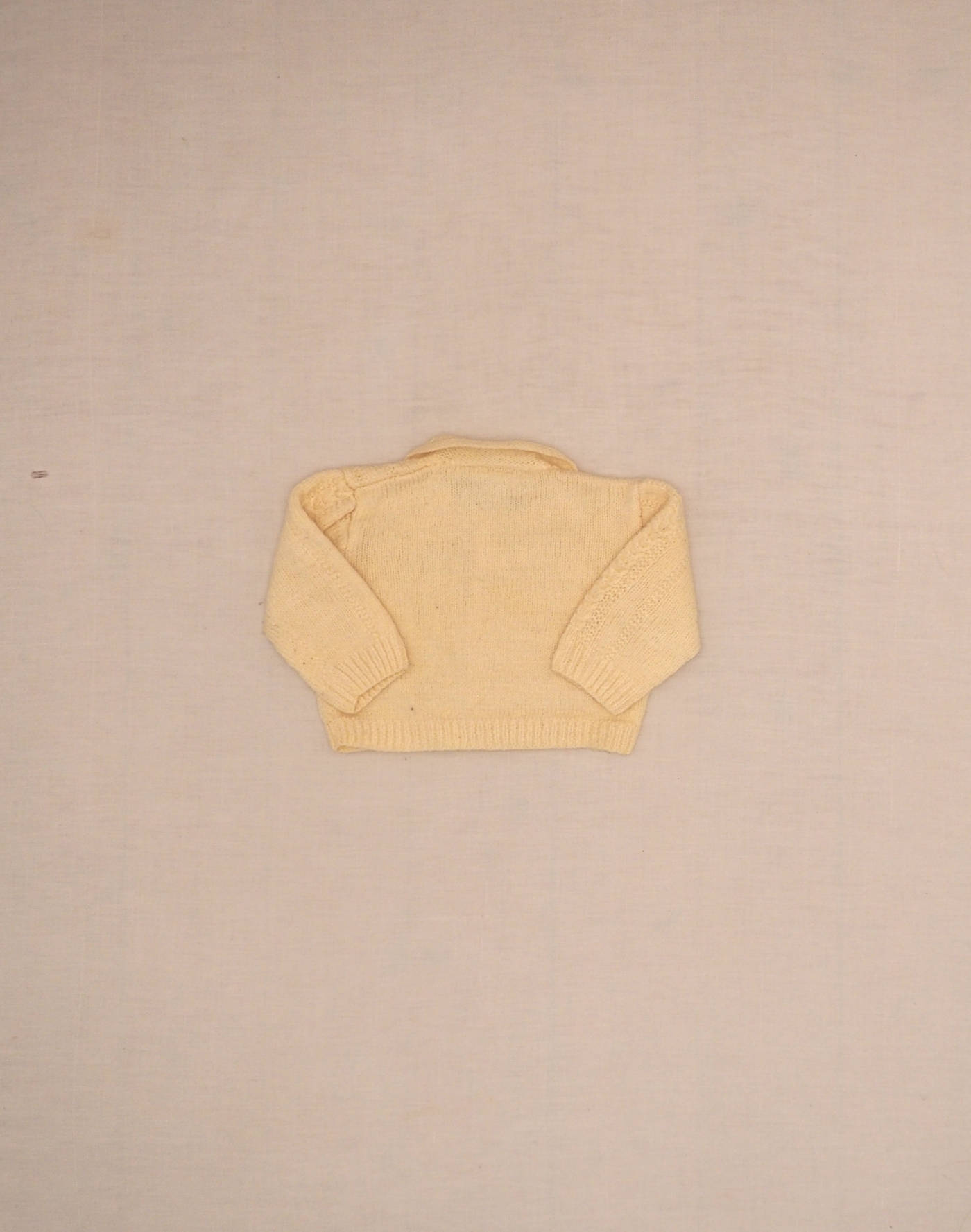 Hand-knit piece. Splendid little ecru cardigan with delicate texture work, small collar, closed with four real mother-of-pearl buttons. Very good condition, soft wool feel.