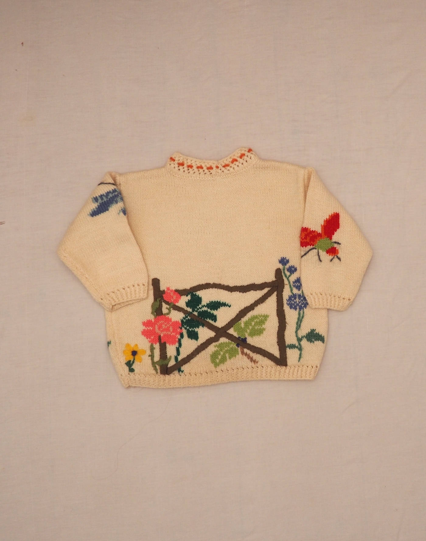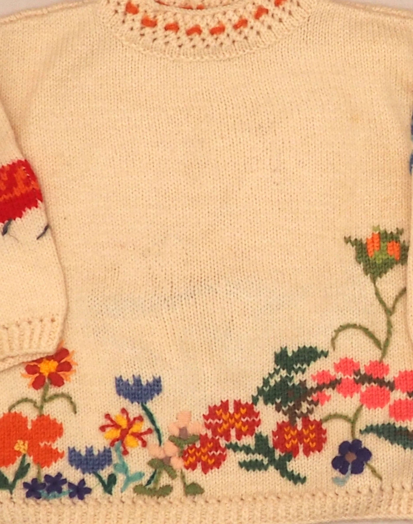 Hand-knitted piece. Splendid ecru sweater with embroidered flower motifs on the waist and back, and insect pollen on the sleeves. Very good condition, soft, thick wool feel.