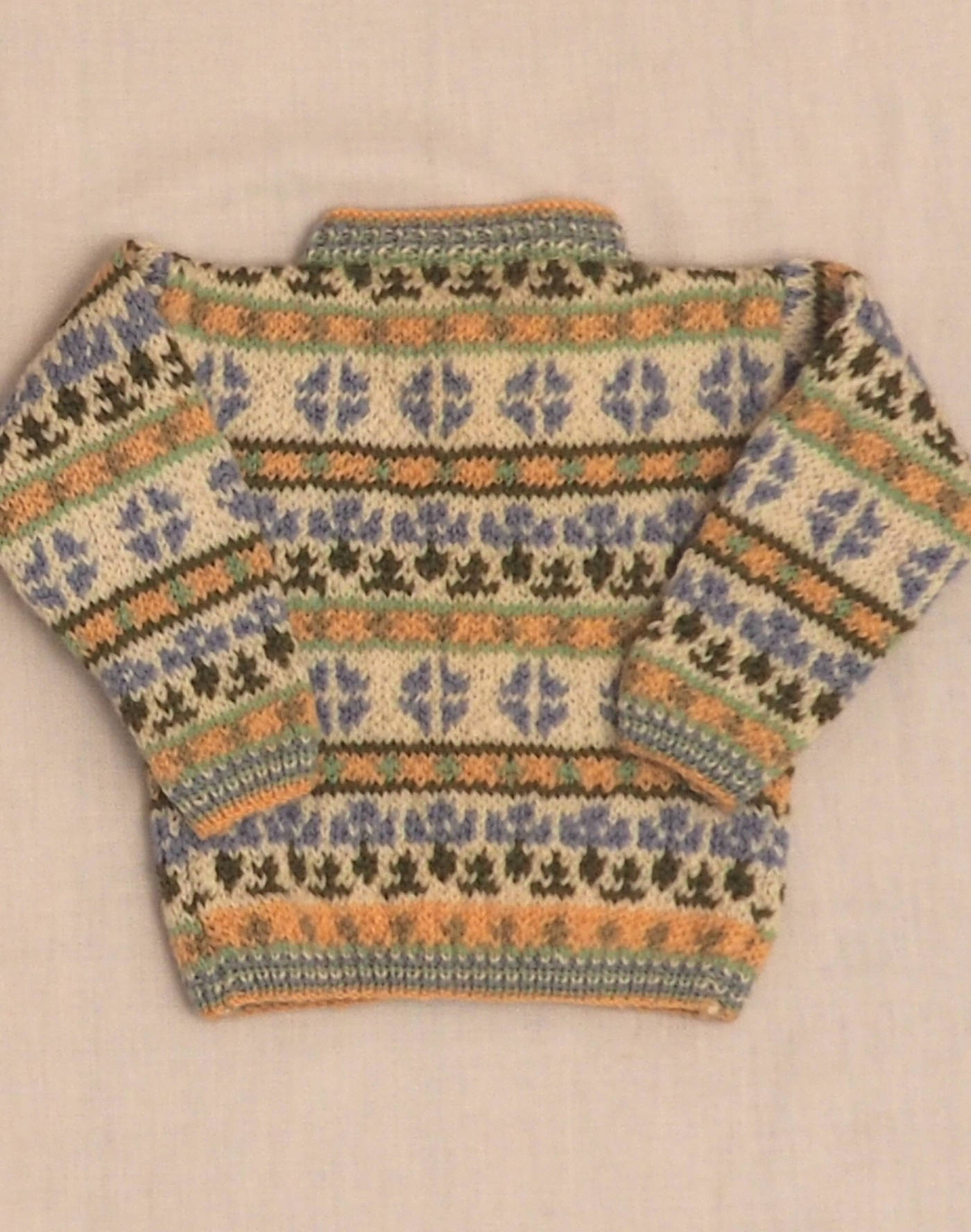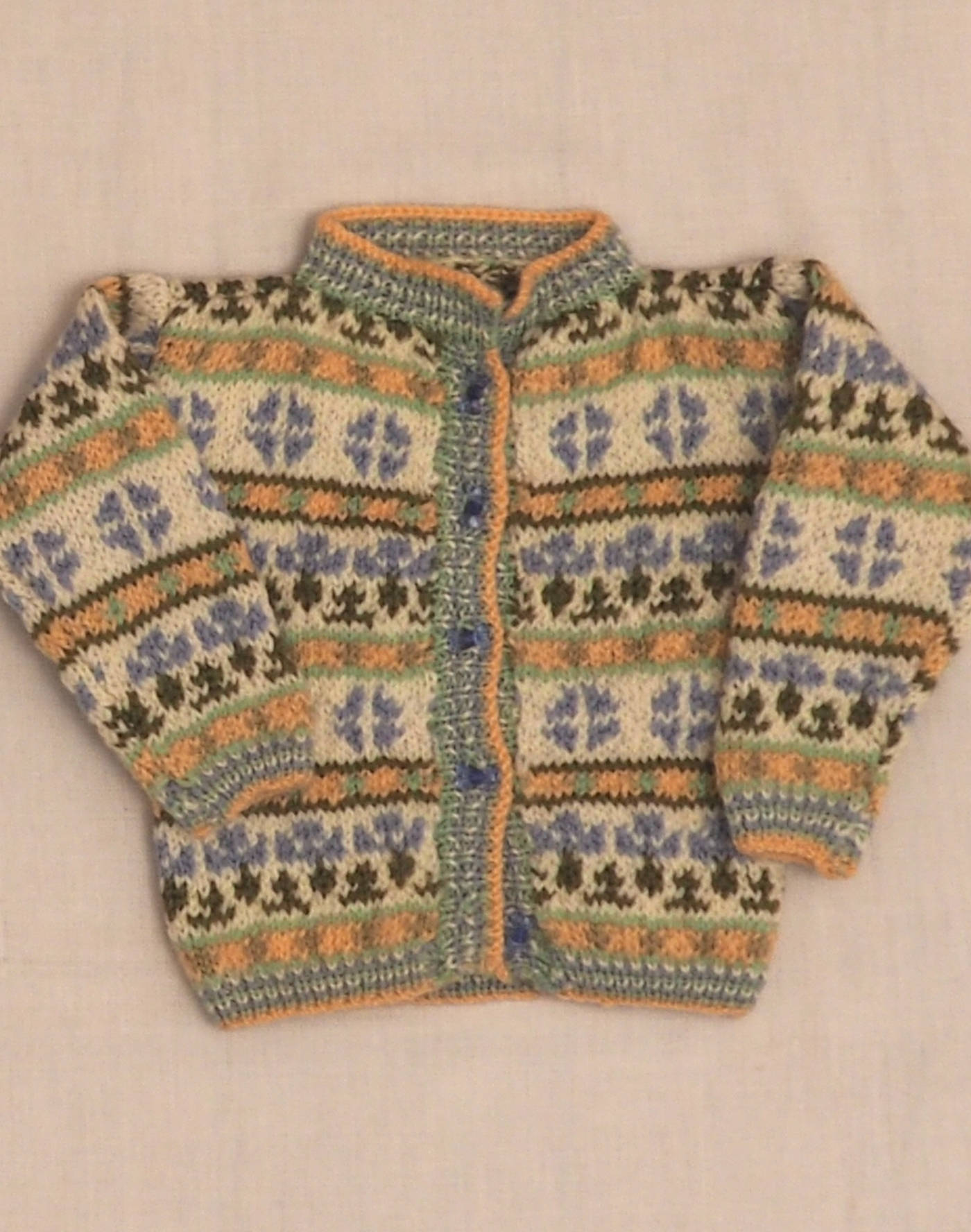 Hand-knitted piece. Magnificent long-sleeved cardigan with multicolored jacquard motif, fastened with five blue bow buttons. Very good condition, handcrafted, soft wool feel.