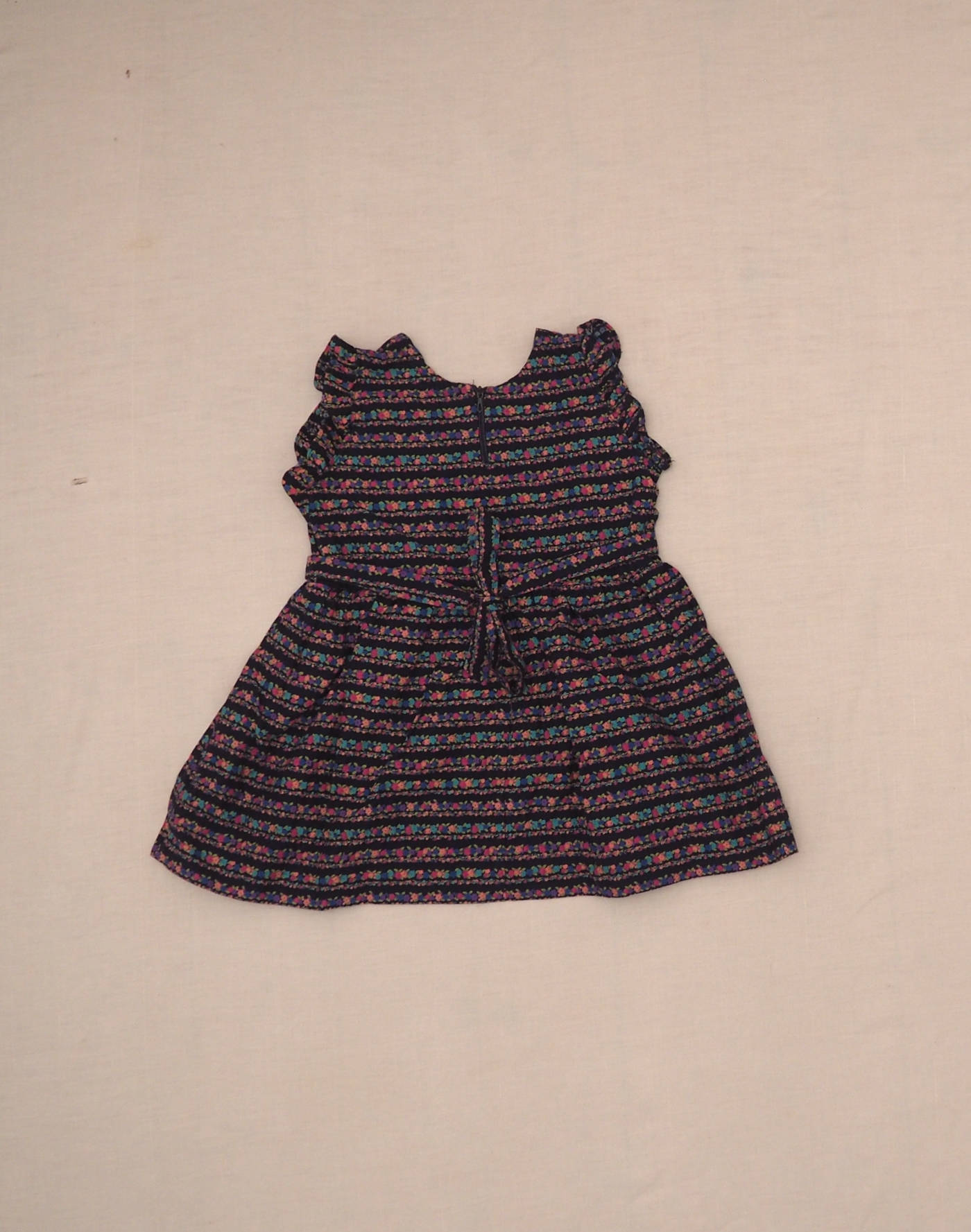 Handcrafted piece, 1970s. Beautiful sleeveless dress in navy blue cotton with flowers, ruffles on the shoulders, pleated waist, tie strap around the waist. Small zipper in the back. Very good condition, no composition label but cotton feel.