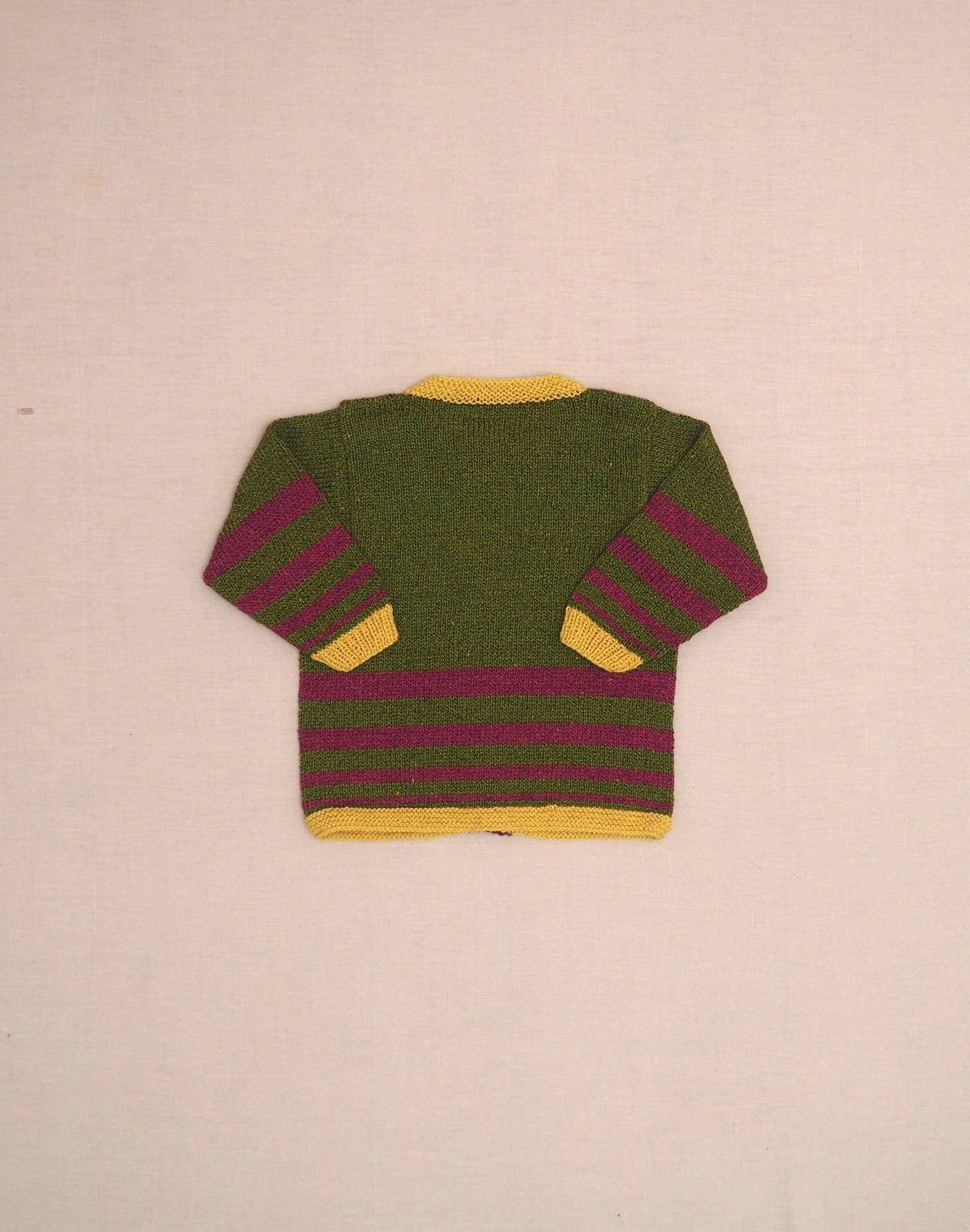 Hand-knit piece. Beautiful olive mottled knit cardigan with contrasting purple stripes, yellow collar and cuffs, fastened with five buttons. Very good condition, soft wool feel.