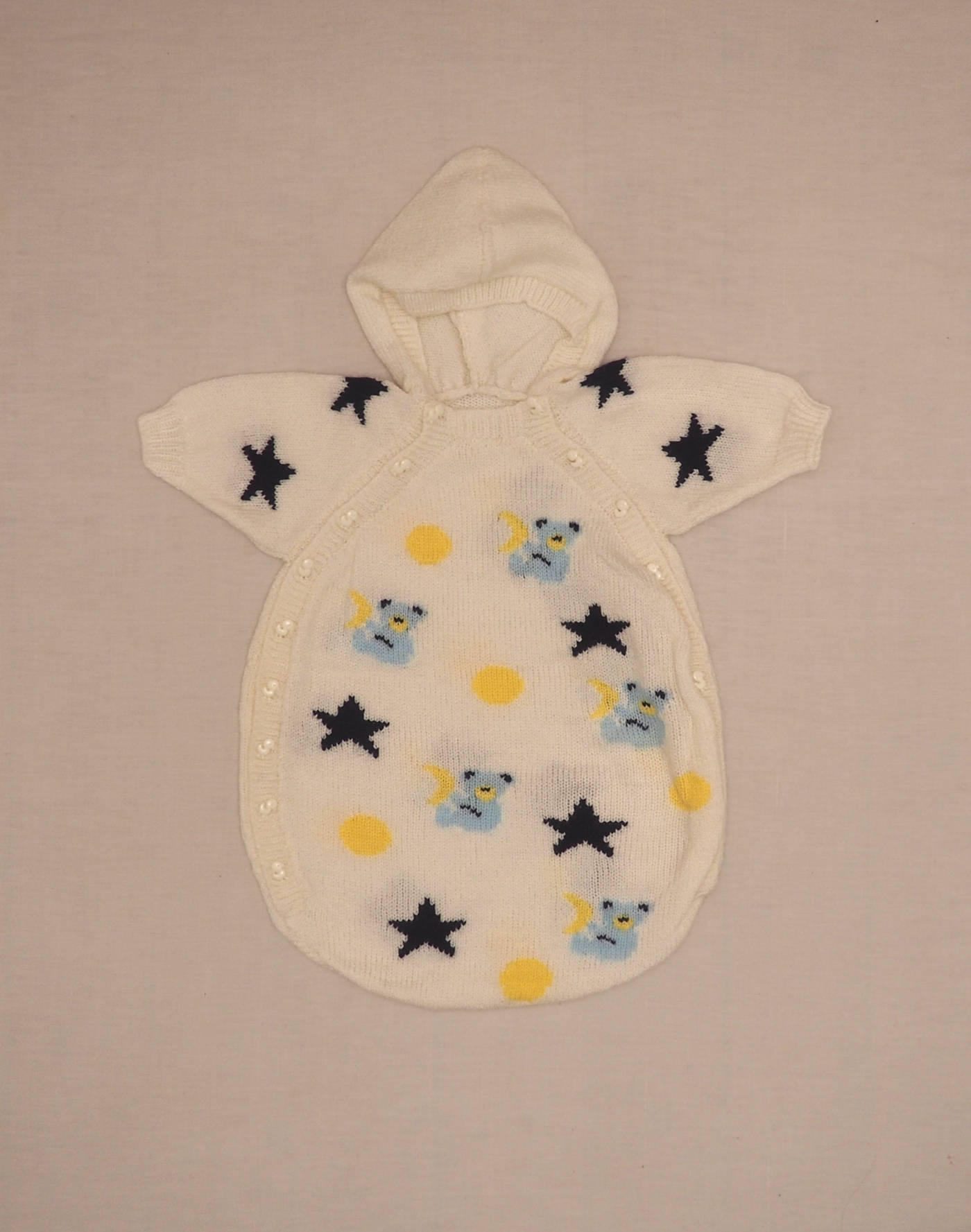Hand-knitted piece. Beautiful hooded turbulette in white knit with stars & teddy bear motif, fastened with eighteen duck buttons. Very good condition, soft wool-blend feel.