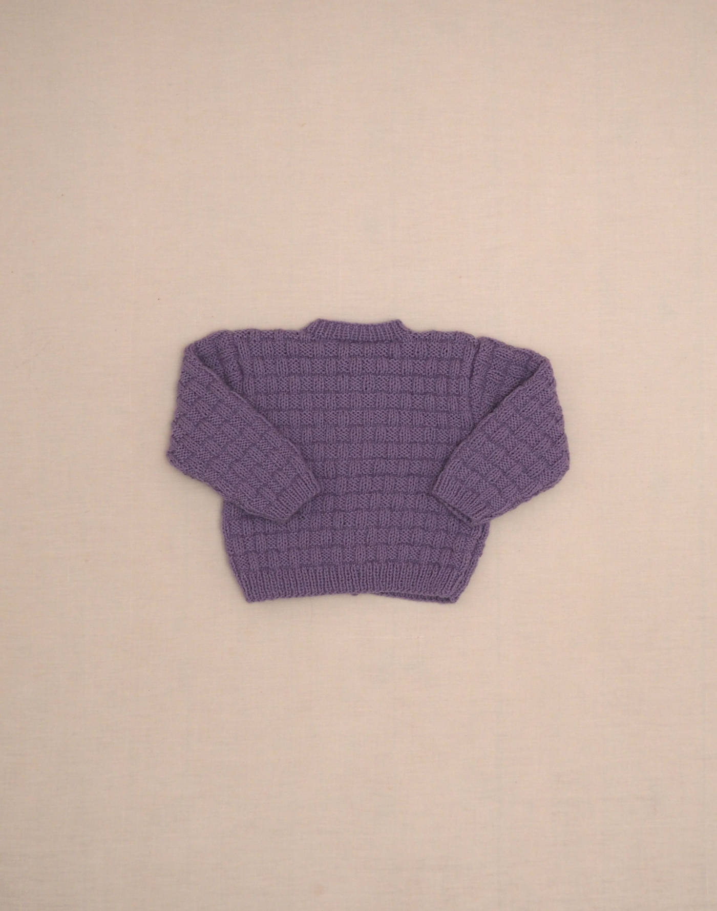 Hand-knit piece. Beautiful cardigan in textured purple knit, closed with quare wooden knobs. Very good condition, soft wool feel.