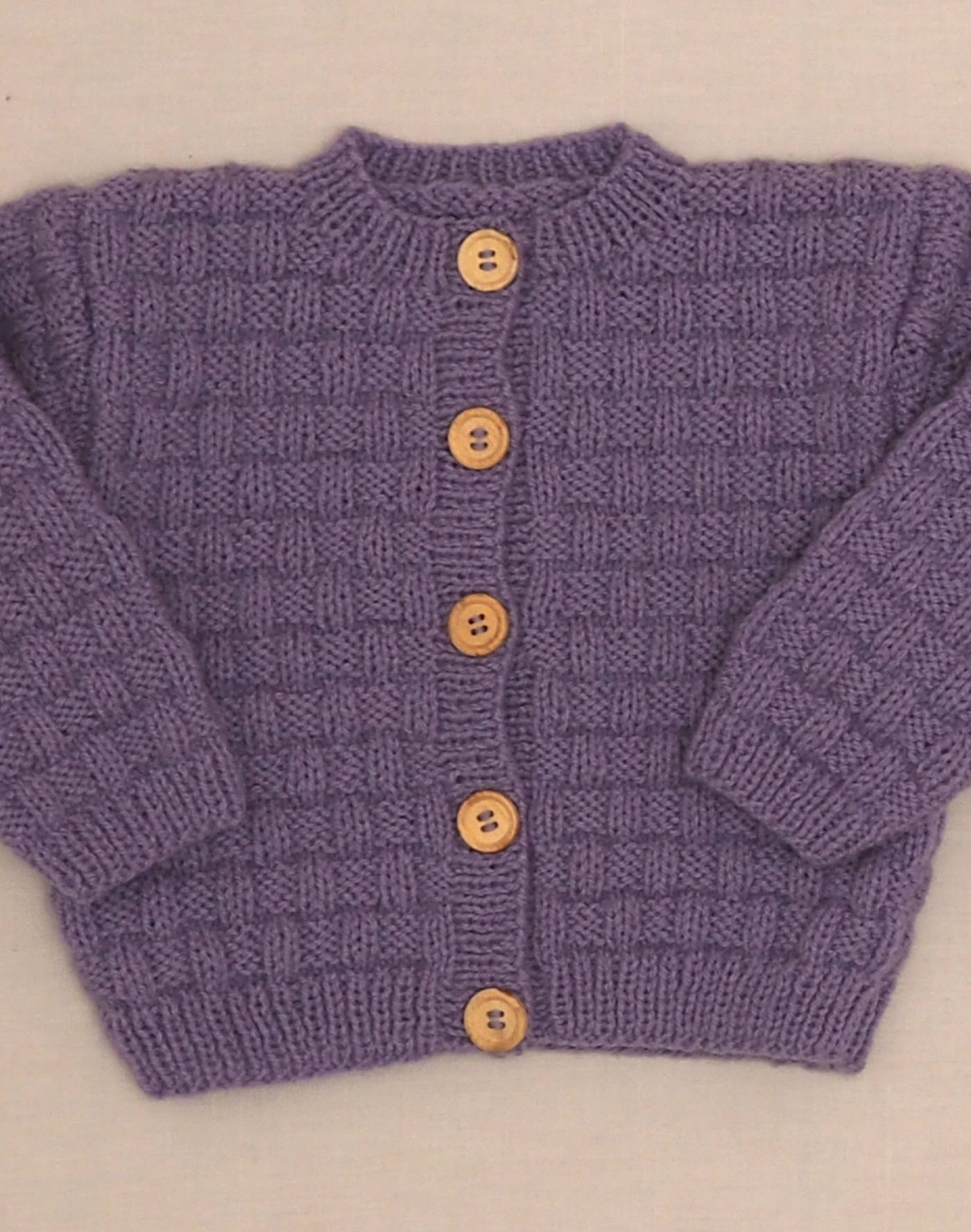 Hand-knit piece. Beautiful cardigan in textured purple knit, closed with quare wooden knobs. Very good condition, soft wool feel.