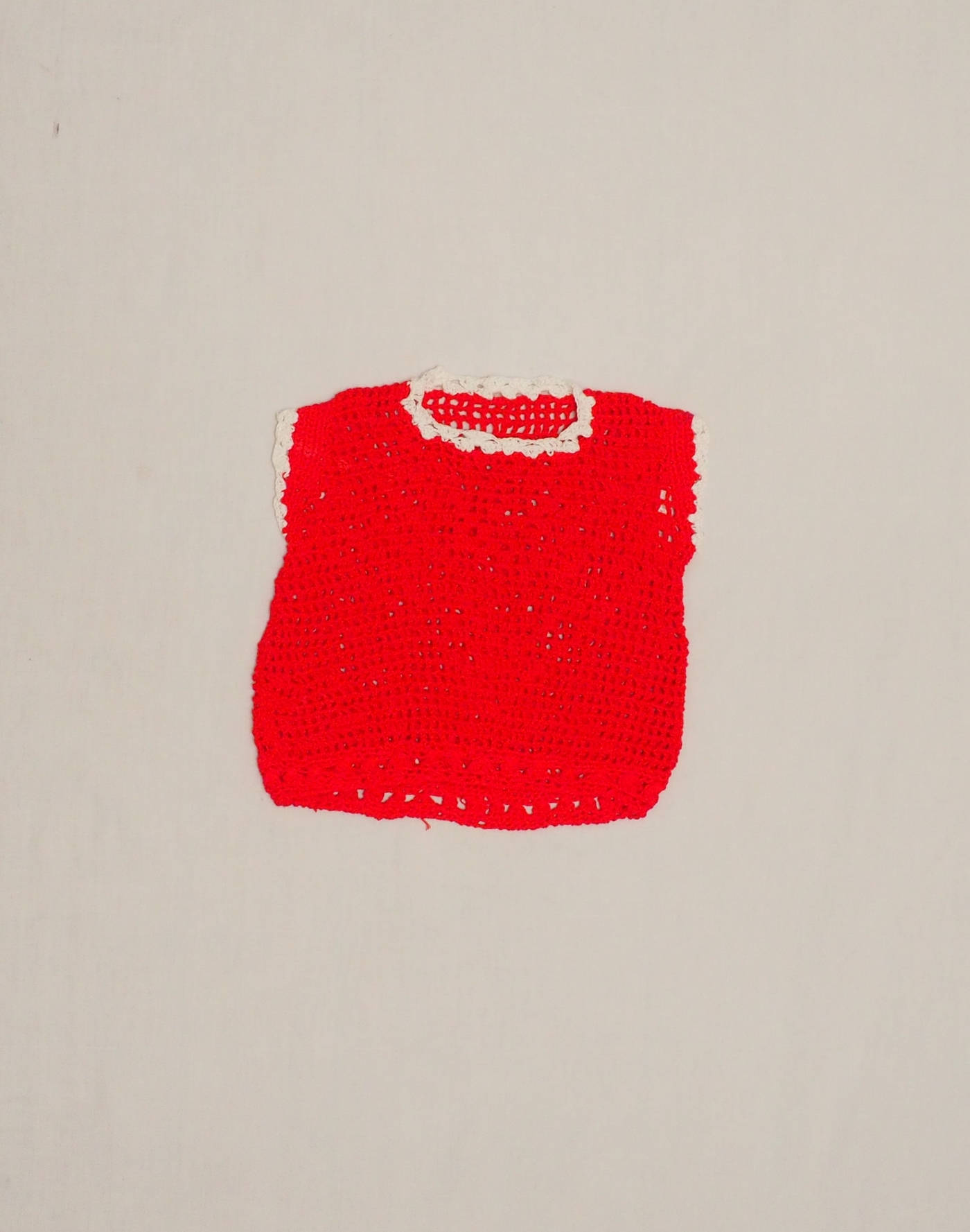 Hand-crocheted piece. Lovely tank top in red crochet, shoulders and collar trimmed in white. Very good condition, handmade piece so no composition label, cotton or cotton blend feel.