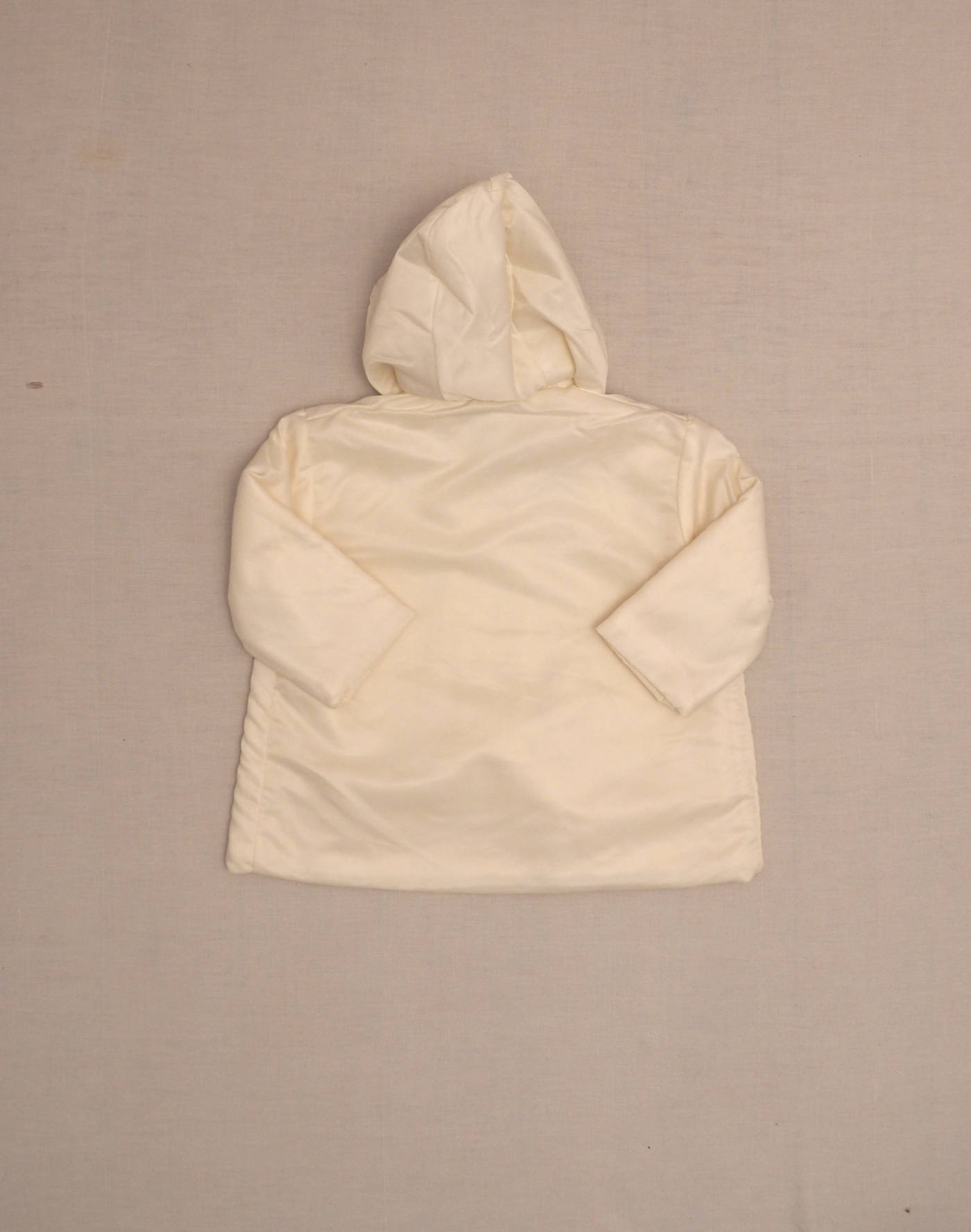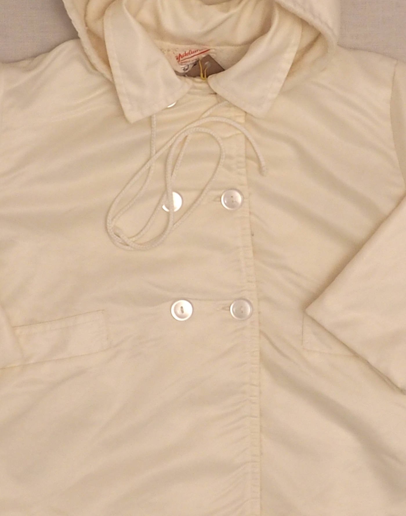 A coat from Les demoiselles de Rochefort. White, 1970s, immaculate. Hood with drawstring, shirt collar, six buttons on front (three closing buttons, three decorative cross-over buttons), two pockets. Fleece-effect inner fabric. No composition label, but synthetic exterior (probably nylon). Very pretty flared cut. Made in France, very good condition, small pilling on lining (invisible when worn). Measurements flat: 40cm high, 38cm from armpit to armpit, sleeve 17cm from armpit to wrist.