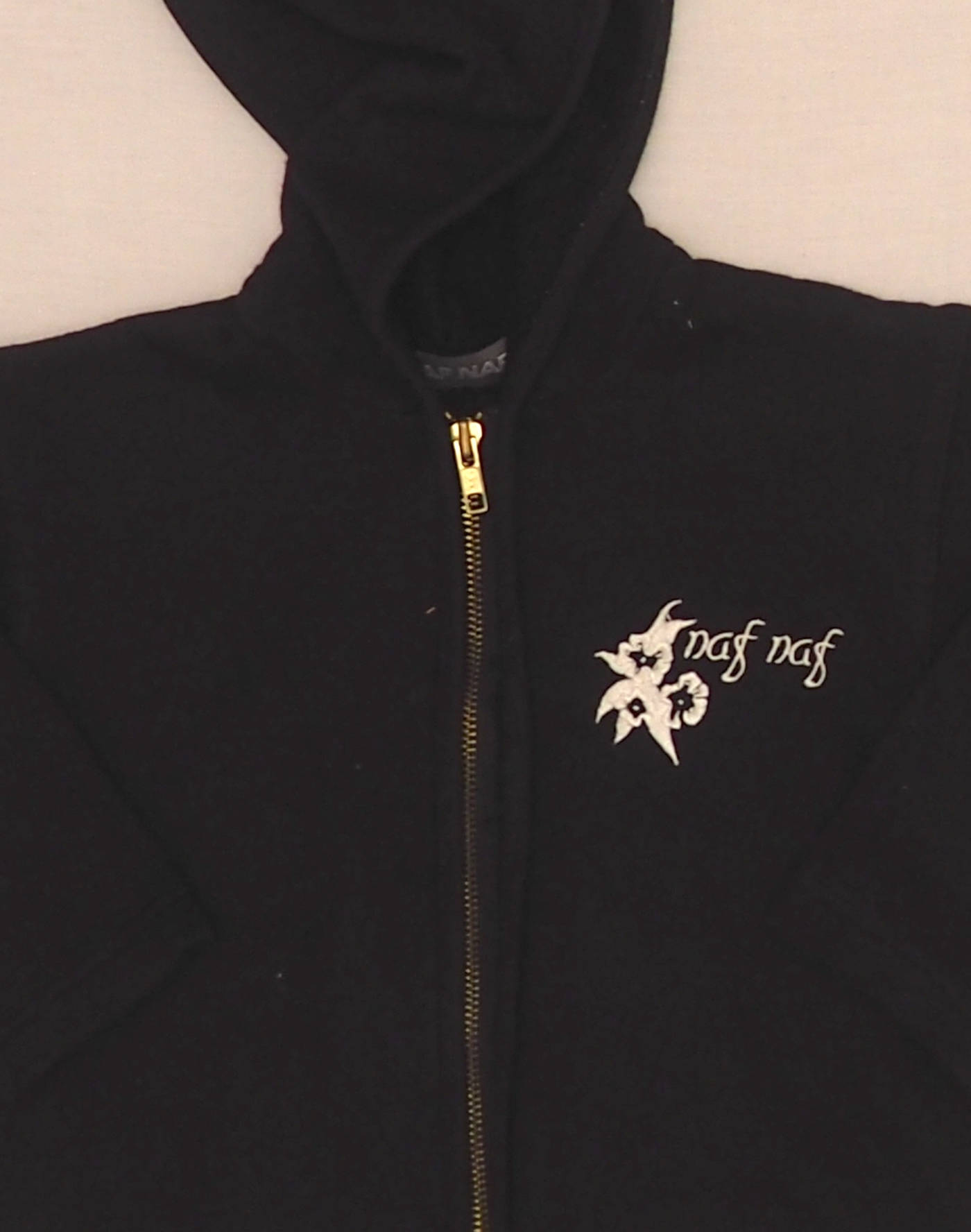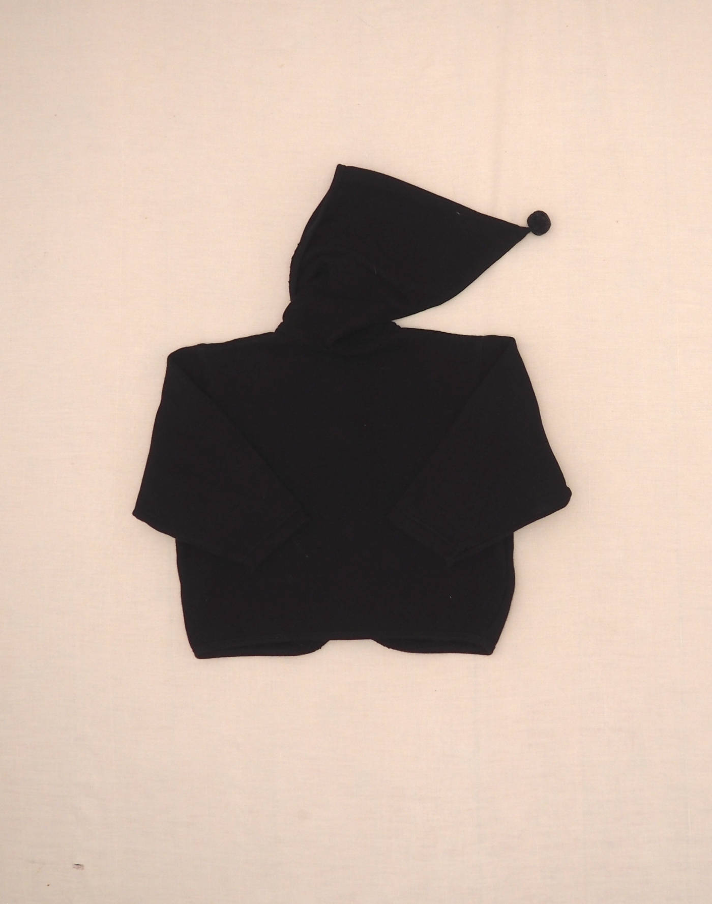 Pretty vest in black sweatshirt jersey with pointed hood topped with a pompom. Embroidered flowers and “Naf Naf” in white on the heart. Zipper closure. Very good condition, jersey 75% cotton, 25% polyester.